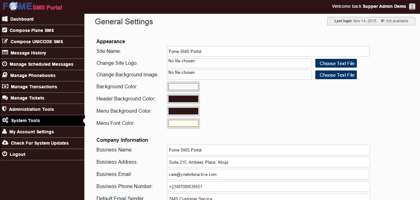 Foe SMS Portal now allows for customization, including Header Color, Menu Color, Background Image, Logo and Font Color customizations.