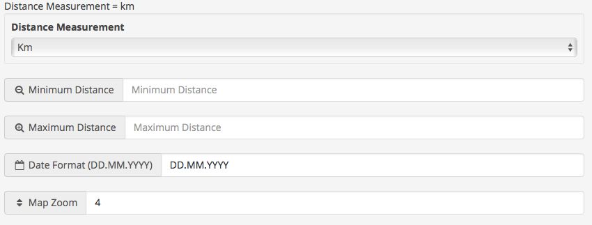 Set the Distance km or mile Measurement (min, max), Date format, Map Zoom.