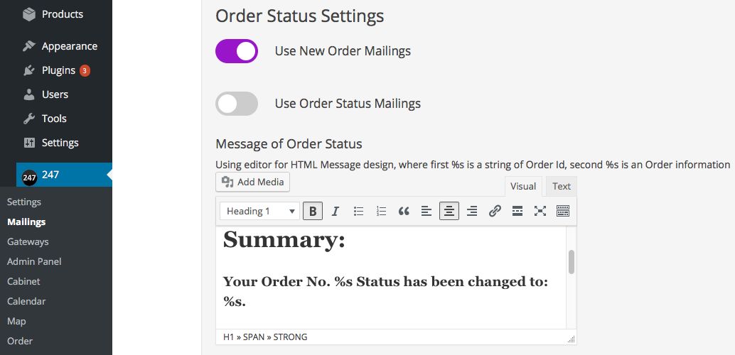 Using editor for HTML Message design, where first %s is a string of Order Id, second %s is an Order information
