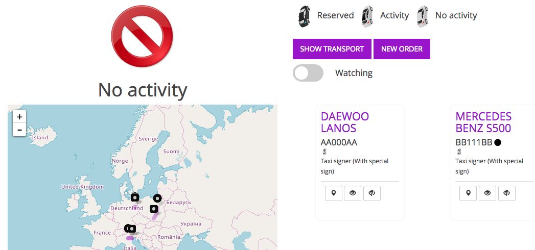 The full information about your order at the Sent orders - the AB addresses, the AB addresses on the map, order time,additional features, car pictures, booking details, the order price . Choose a car at the complete the order list, choose the order status at the reset a status. If you push the map button you will watch the route on the Map.