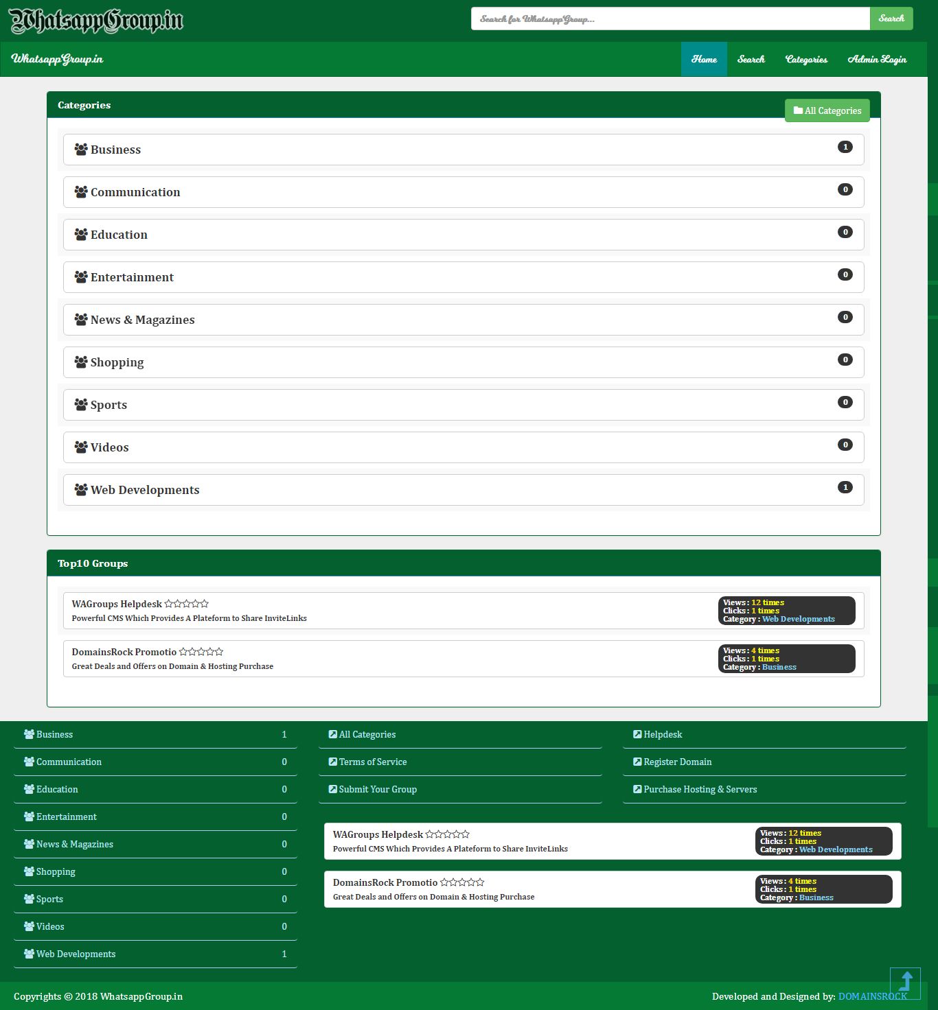 WAGroups - A Powerful CMS Which Provides A Platform to Share InviteLinks of Whatsapp Groups Over Internet with Unlimited Users. There are More than 30 Categories and You can Add More Categories as Your Requirements and also You Can Delete Un-Required Categories. In this CMS Users can Add Unlimited InviteLinks of Whatsapp Groups. It is a Powerful Website CMS. More Features will also Available Soon in Our Every Update.