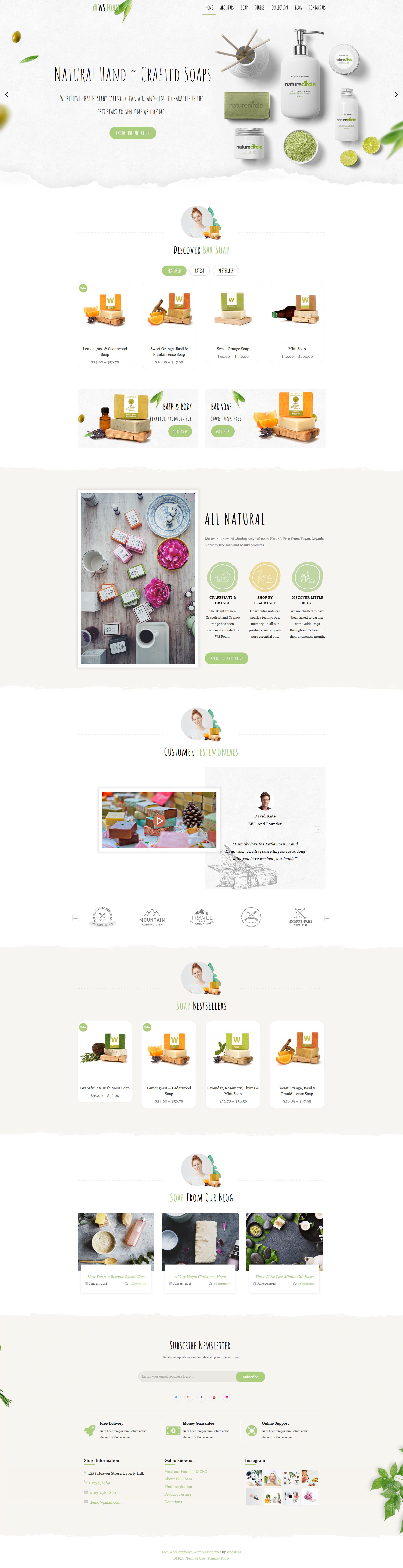 WS Foam is a shopping cart Soap WordPress theme which is well-developed on the powerful Woocommerce and Genesis Framework, this theme is especially used for online shops selling shampoo, body wash as well as any products relating to body/hair care. Inspired from the environment-friendly ideas, WS Foam has brought to you with a beautiful green design, with eye-catching images from Smart Slider and many other great integrations, which makes your site more gorgeous than ever. Besides, the specific and unique content organization of WS Foam is also a big plus, because visitors will never be able to get bored while exploring your shop information. Moreover, since you are working as an online shop, it will be greater if you can earn more mobile traffics – which requires you to have a mobile-friendly website. Don’t worry because WS Foam gets it covered for you with a fully responsive layout on all kinds of mobile devices! Let’s give the theme a look!