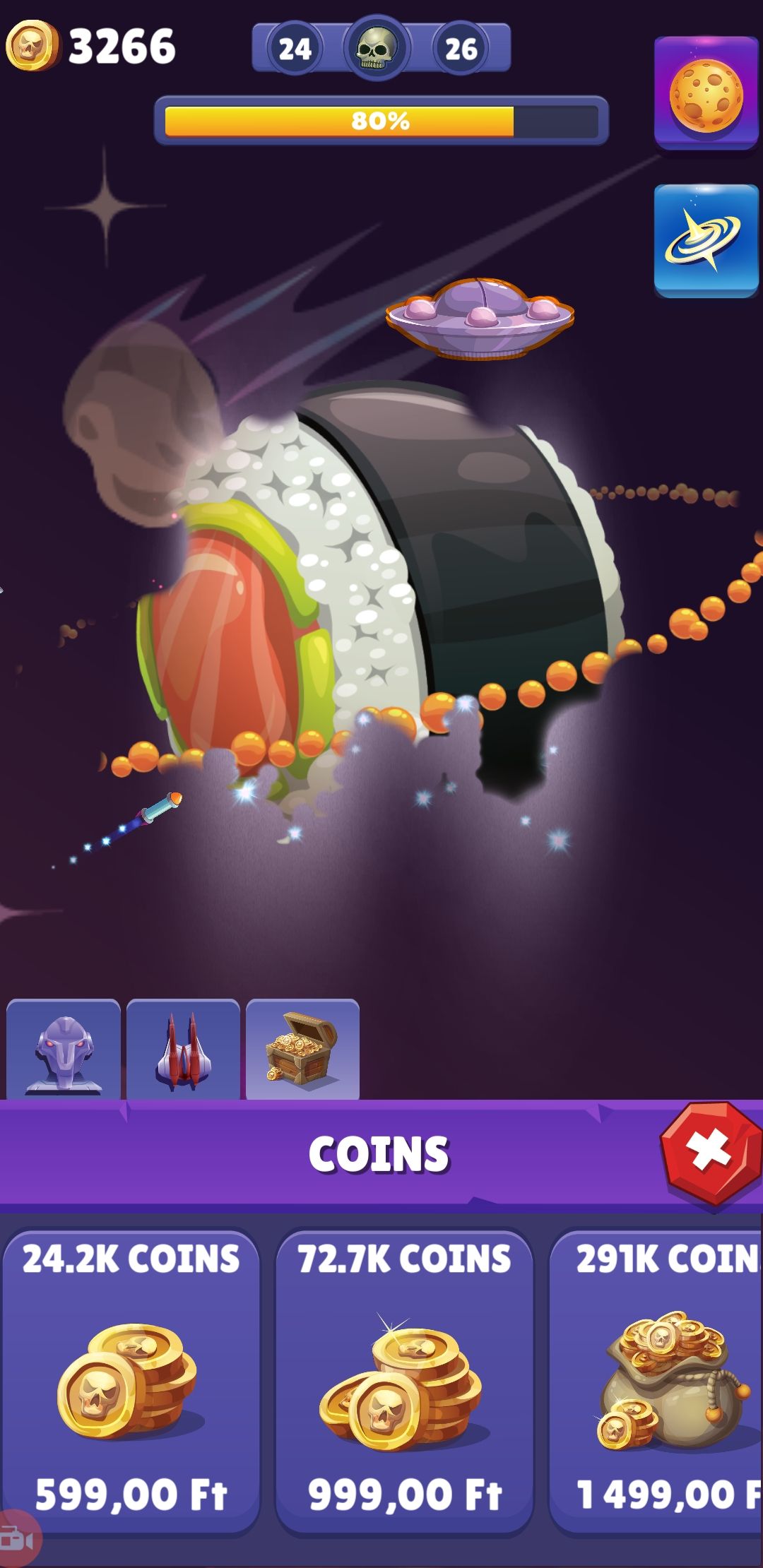- Bonus rewards (in every 60 seconds an alien ships fly in -> if the player clicks on it he gets bonus coins