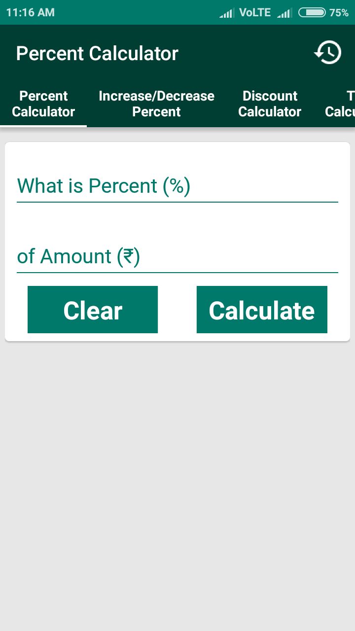 Percent Calculator is a simple, rich design, intuitive and stable app intended for daily use. It is an application designed for making fast calculation whether in school, at office, at home, during shopping or at restaurants. It is very simple to use in daily life. Every functions of this app is very clear and easy to understand. Also result of the calculation display very simple way so everyone can understand easily. You needs to enter require data and in one click result will display. After perform any calculation it will automatically store in history for further use. You can see all past calculation in history screen. You can also clear the history.
