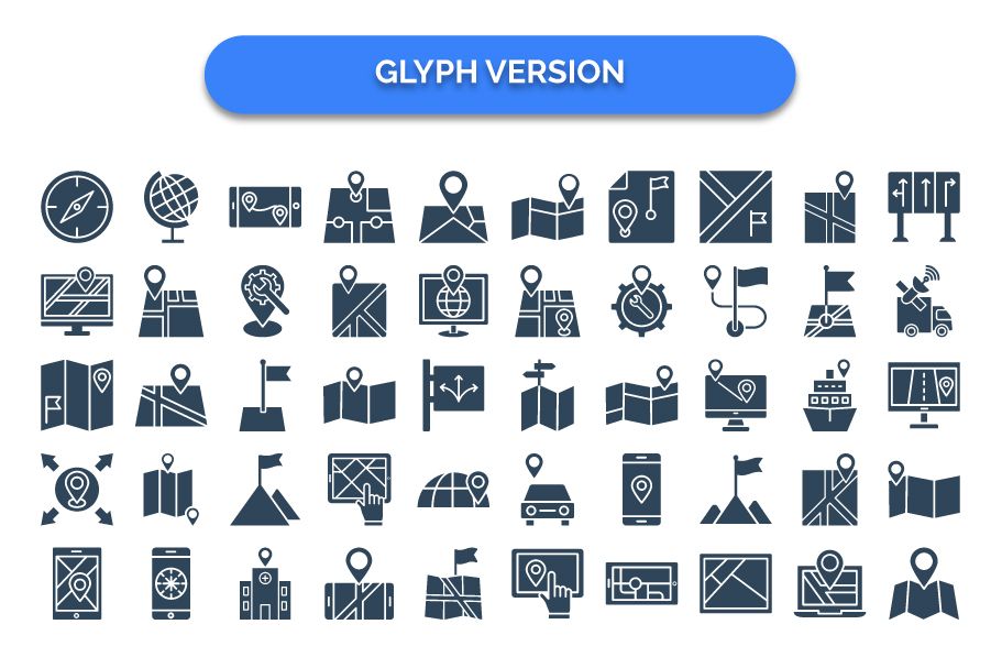 Tags | navigation, gps, compass, destination, GPS Navigation, color icons, line icons, directional, filled icons, glyph icons, geography |
