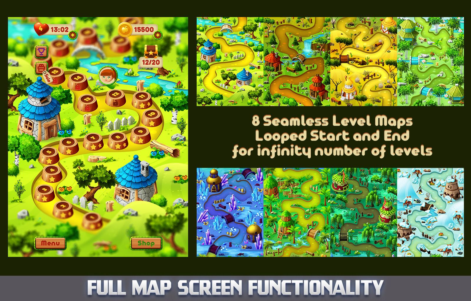 • 8 Backgrounds for Game and 8 Seamless Backgrounds for Level Map Screen (Looped End and Begin) in PNG, 2048 X 2732.