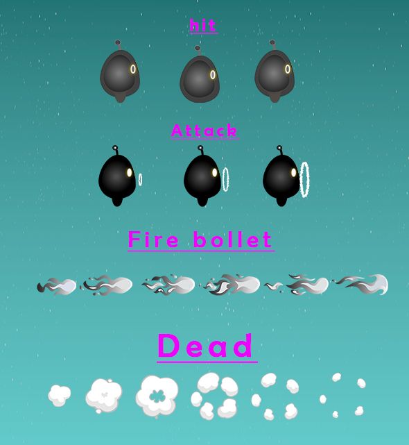 IDLE, RUN, Walk, Jump,fire, hurting, DIE