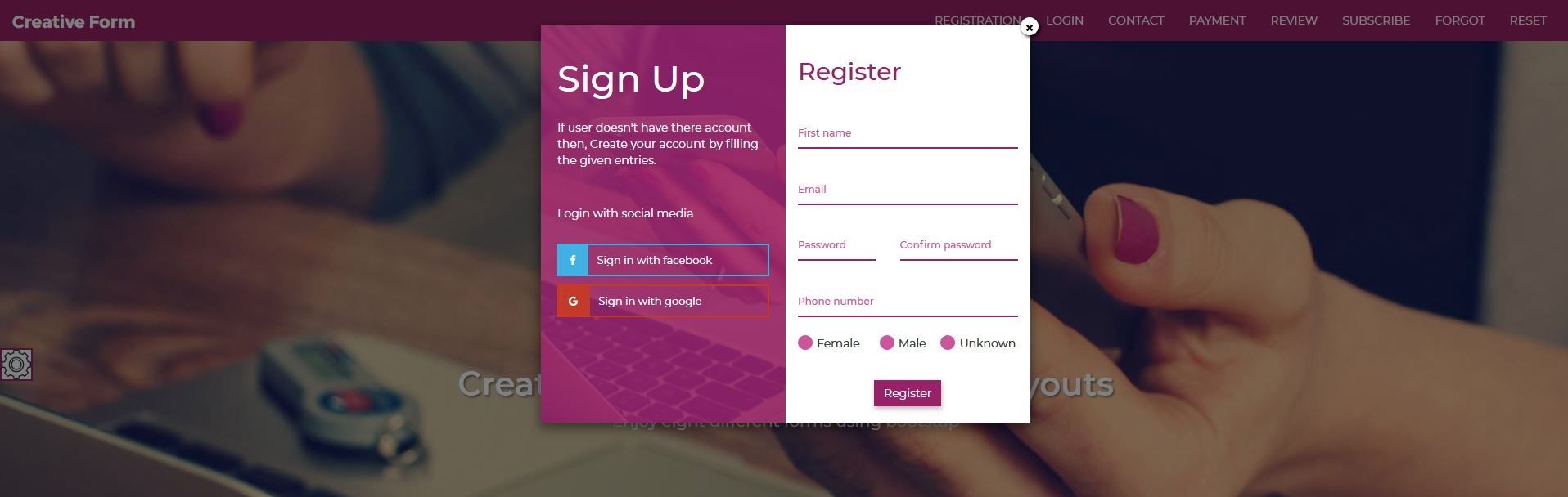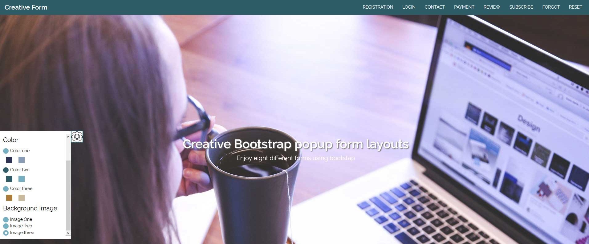 Creative - Popup Form is a HTML5 & CSS3 responsive template. User can easily customize and use this forms in their particular website. And, there are eight types of forms (registration, login, contact, payments, review, subscribe, forgot and reset) with different settings like color, image, and font-family. There user can change the layout as per their requirement. It is a fully responsive, rich feature and it supports bootstrap framework and integrated font awesome icon set. So, its really easy to customize and develop as your own styles.