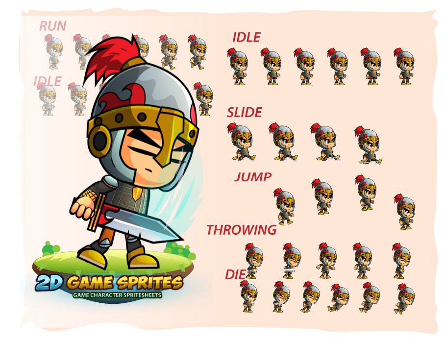 IDLE, RUN,RUNNING with GUN, THROWING, SHOT, ATTACK, ROLL,DIZZY JUMP, SLIDING, DIE.