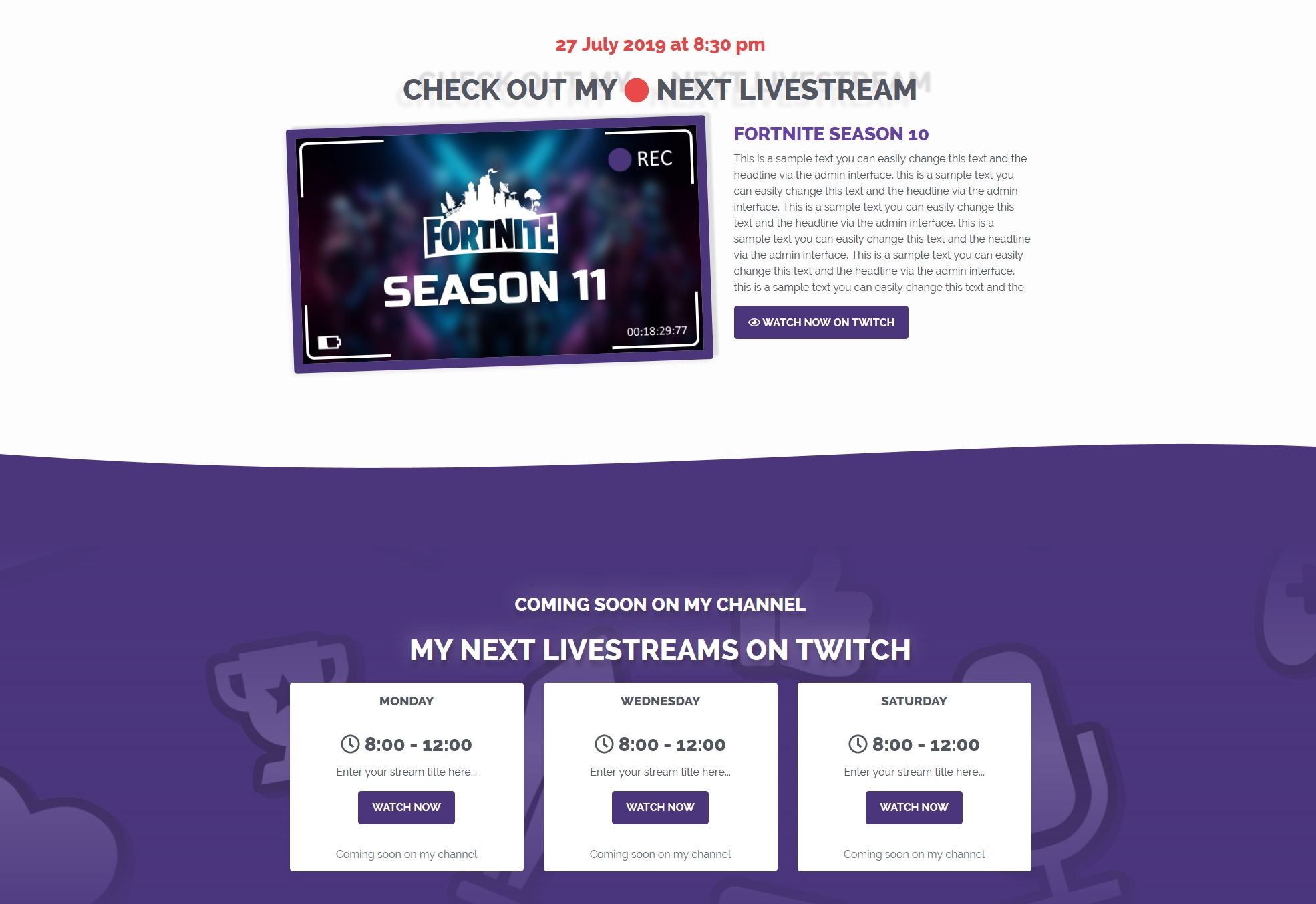 You are online streamer, and looking for a suitable website? Then STWITCHR is just right for you, with STWITCHR you create your own website without any programming knowledge. STWITCHR is Multilanguage and can therefore be translated into any language easy and fast via the integrated admin interface. In addition, STWITCHR offers your community a lot of added value, so you can easily inform about upcoming livestreams or you can present your latest video on Twitch or possibility to bundle all social media on your own page.