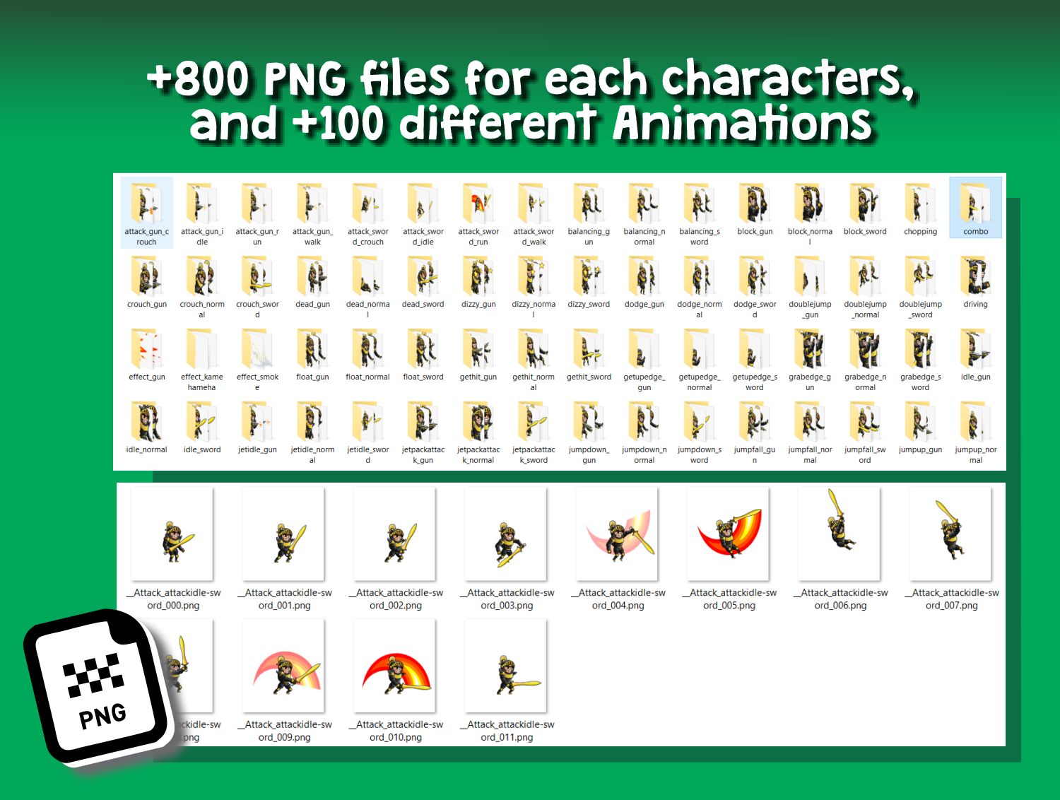 Ai and Eps File is just contains Vector Body Parts only, and there is no AI or PS for character sprites It’s because Animation is done in BRASHMONKEY SPRITER!. But there is a high resolution PNG images for every Animation sprites