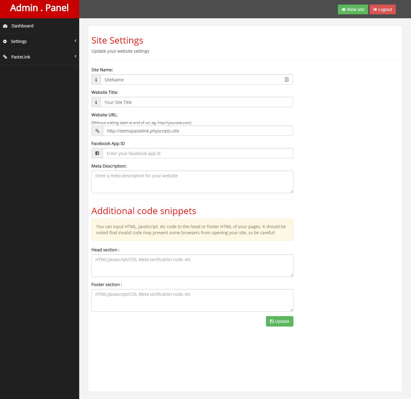 You can change site settings, paste ad code, manage active/inactive paste's.