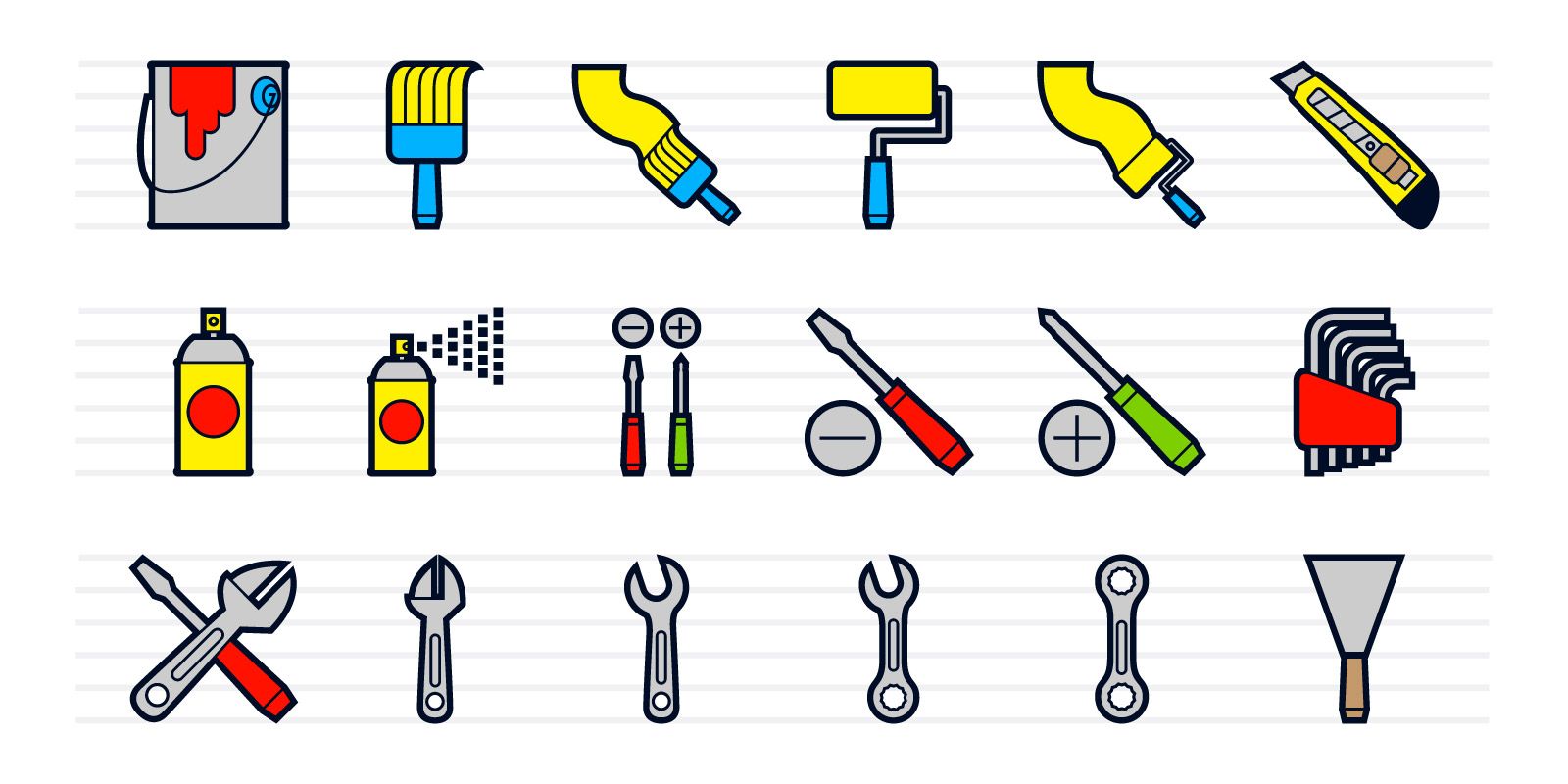 | Tags | cutter, Nails, scraper, wrench, screwdriver, hammer, drill, axe, pliers, allen keys, paint brush, handsaw, paint bucket, spray can |
