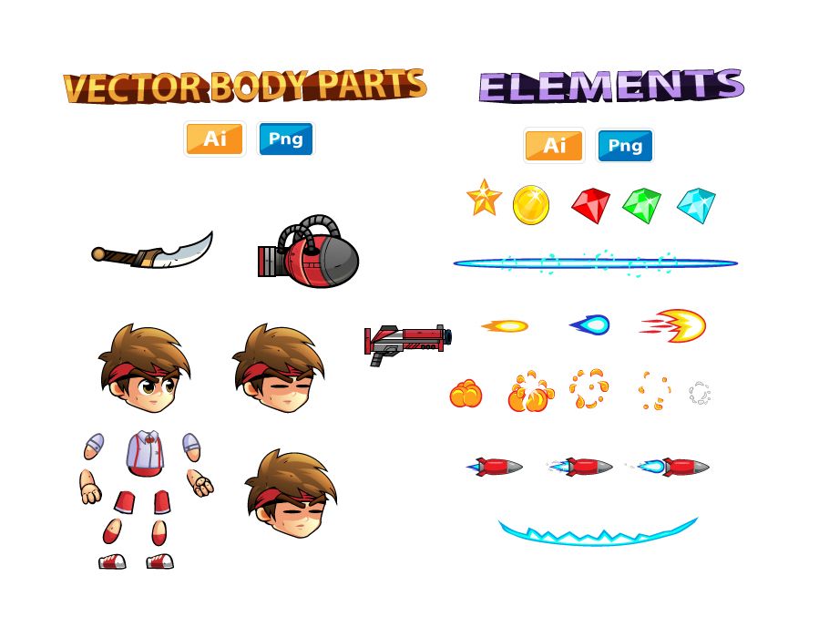 Note: The .AI and .EPS files just contain vector body parts because the animations themselves are done in Spriter.