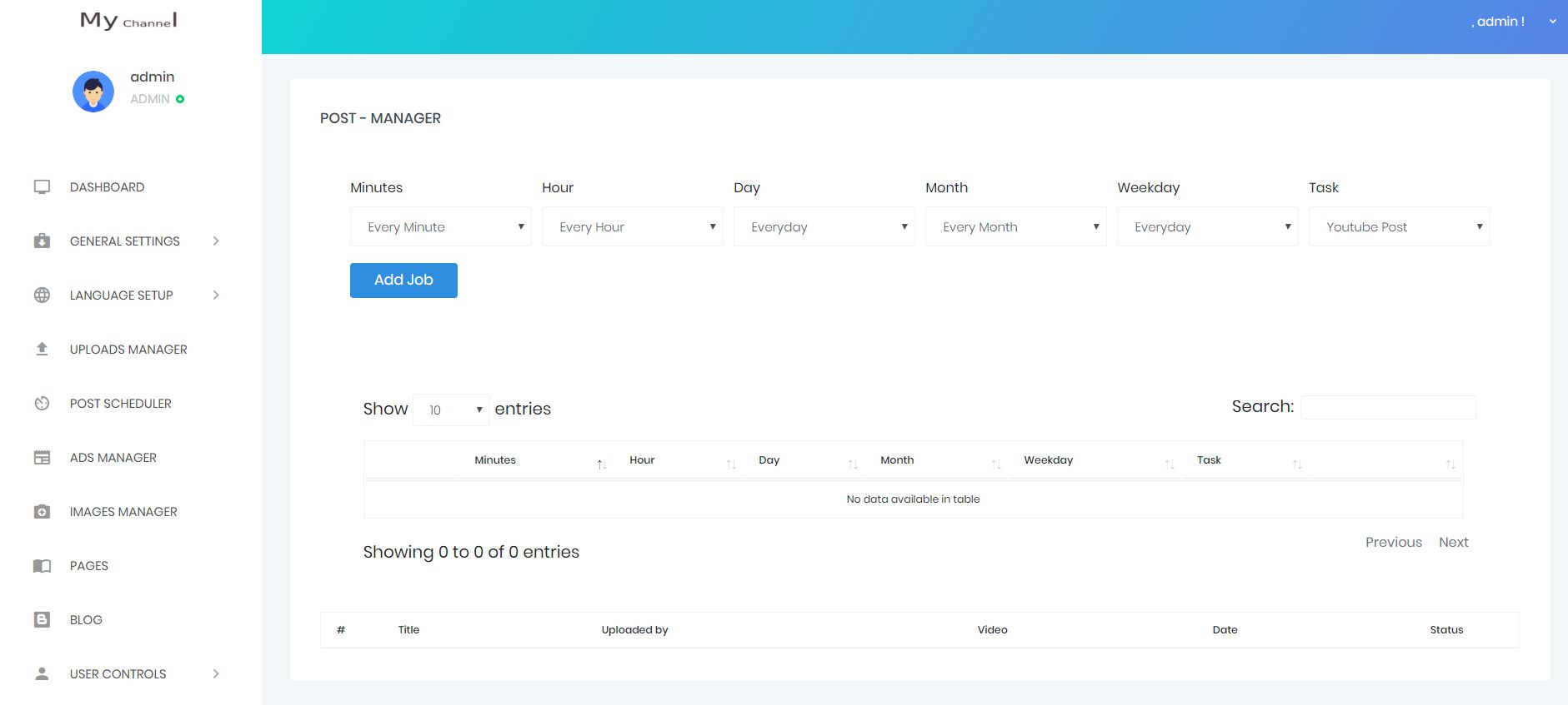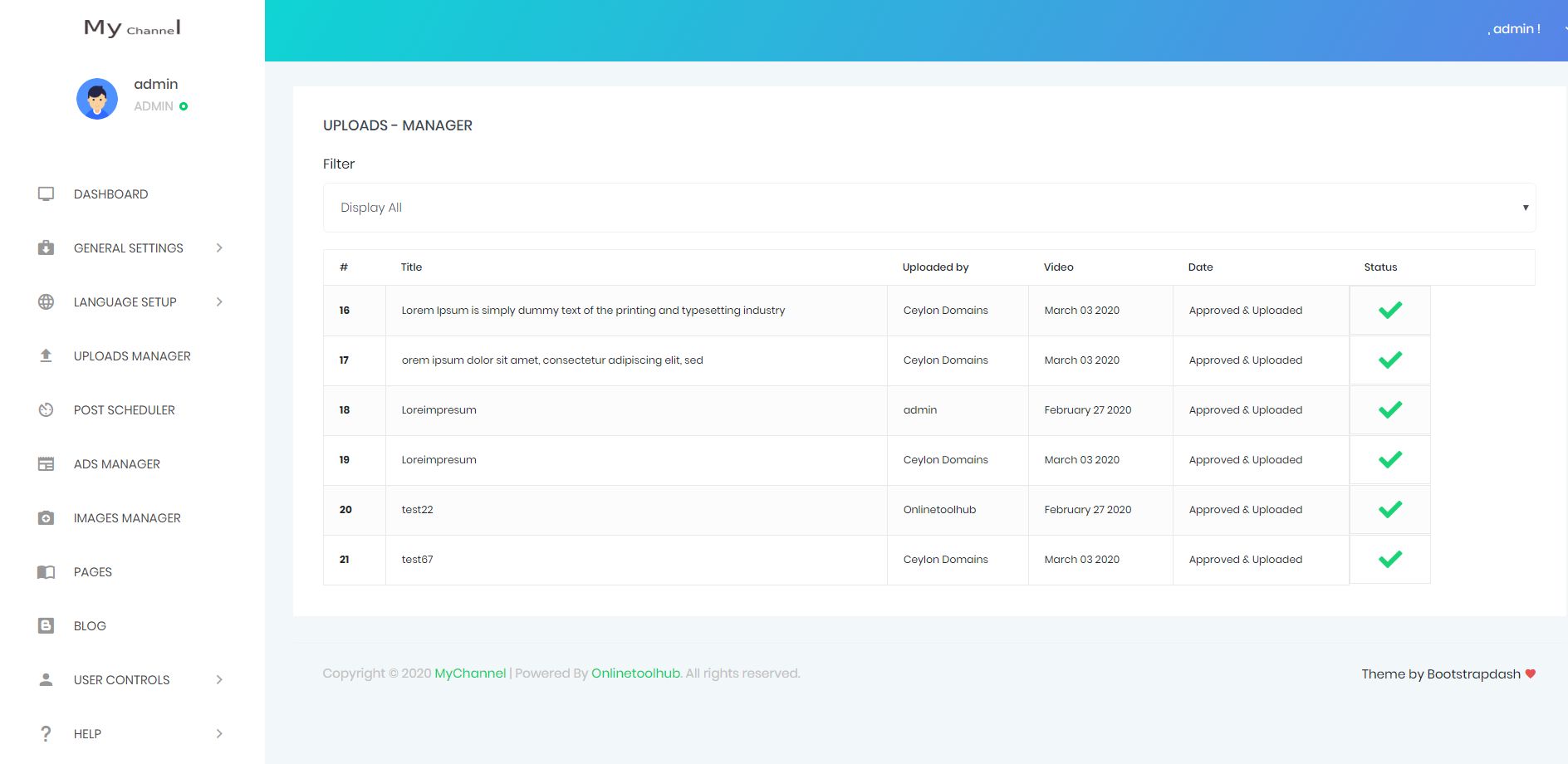 My Channel has 2 main features , the first one is, it allows you to create a website using your youtube channel. And there are multiple ad options that you can use to monetize your website. In addition to this feature script will also allow other users to upload videos to your youtube channel. But in order to make an upload user will be required to login to your website using their youtube account . After uploading the video , this video will be waiting for admin’s approval. Finally after admin’s approval video will be uploaded to your youtube channel.