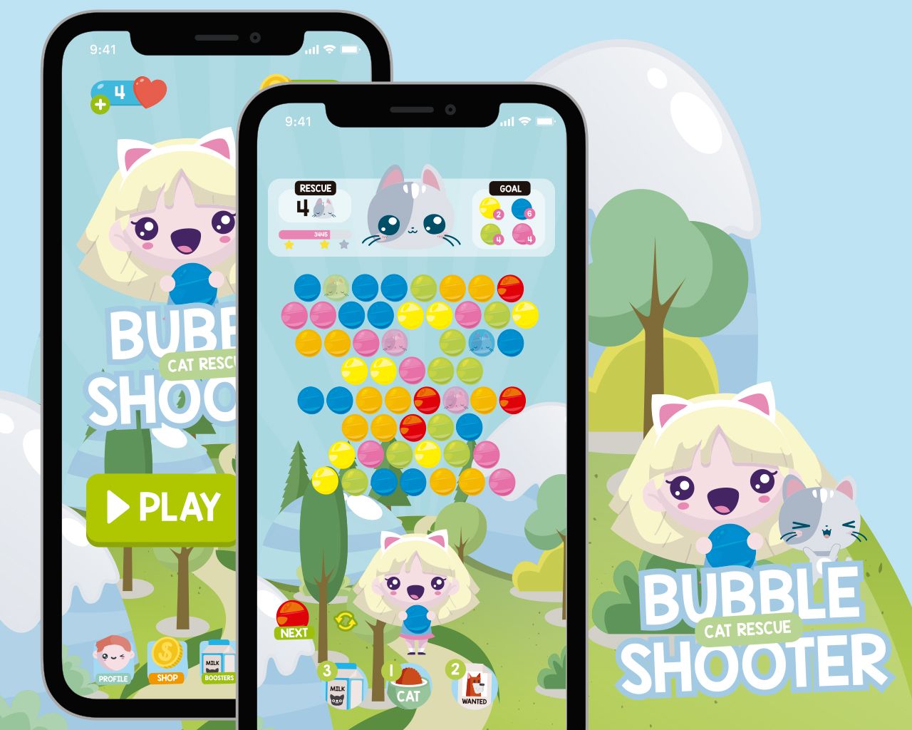 Bubble Shooter Rescue the Cat Game Gui Assets / includes: graphics, buttons, objects, mobile game buttons, share options, menus, backgrounds, Screen samples, and much more elements