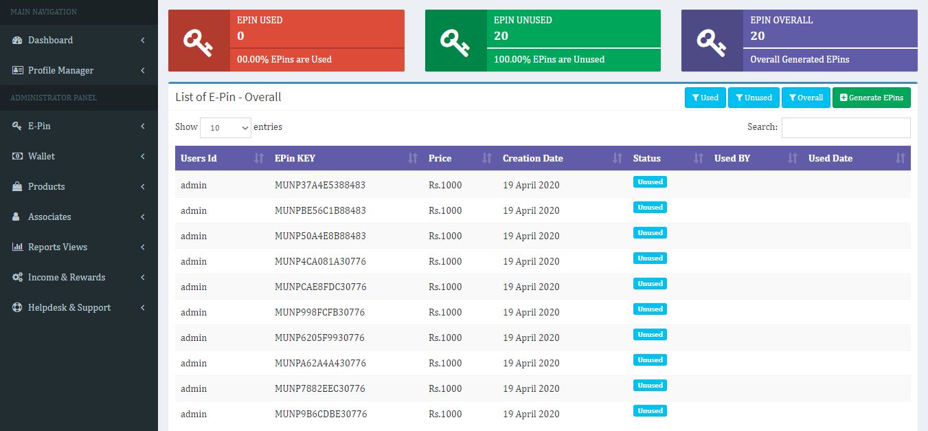 - Generate EPin for Any Members for Product Based or Without Product Based.