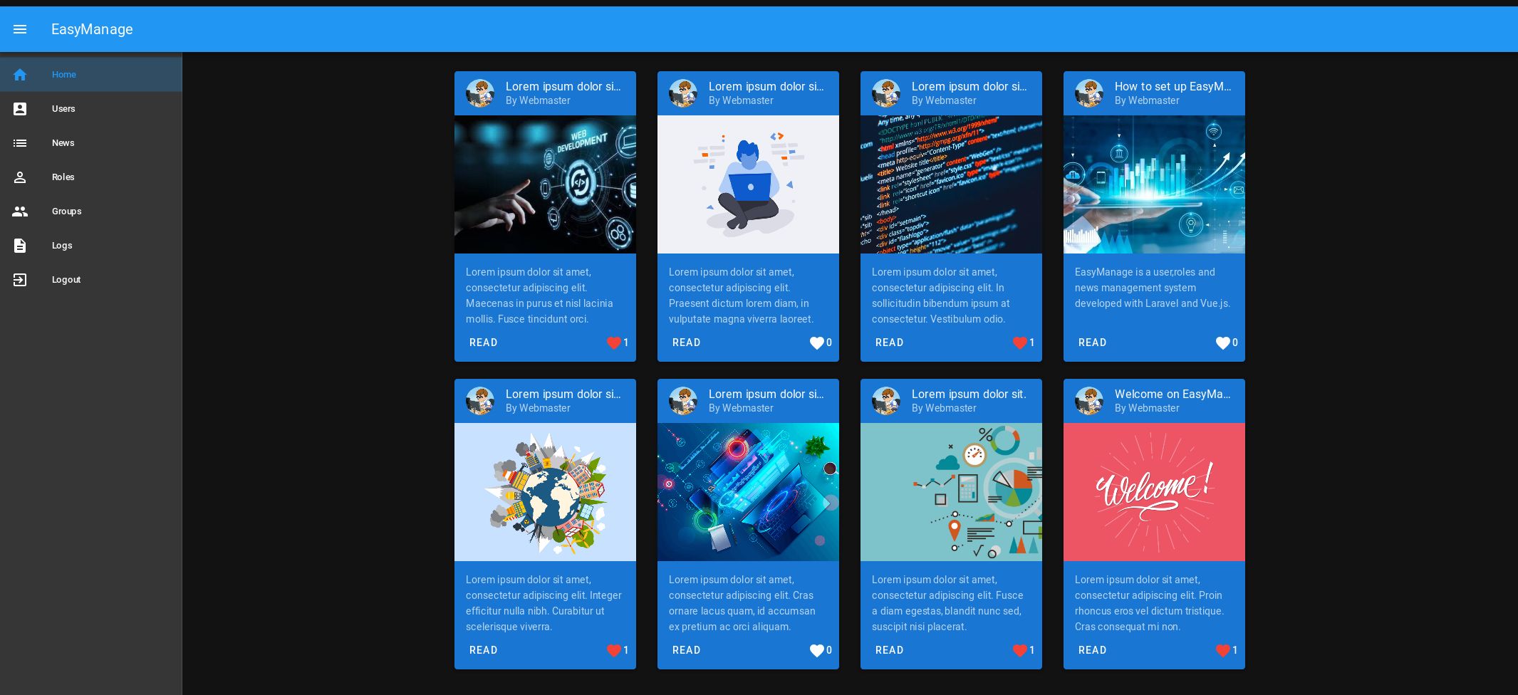 EasyManage is a user,roles and news management system developed with Laravel and Vue.js to provide you the essential functionalities and a user friendly design to start a project.
