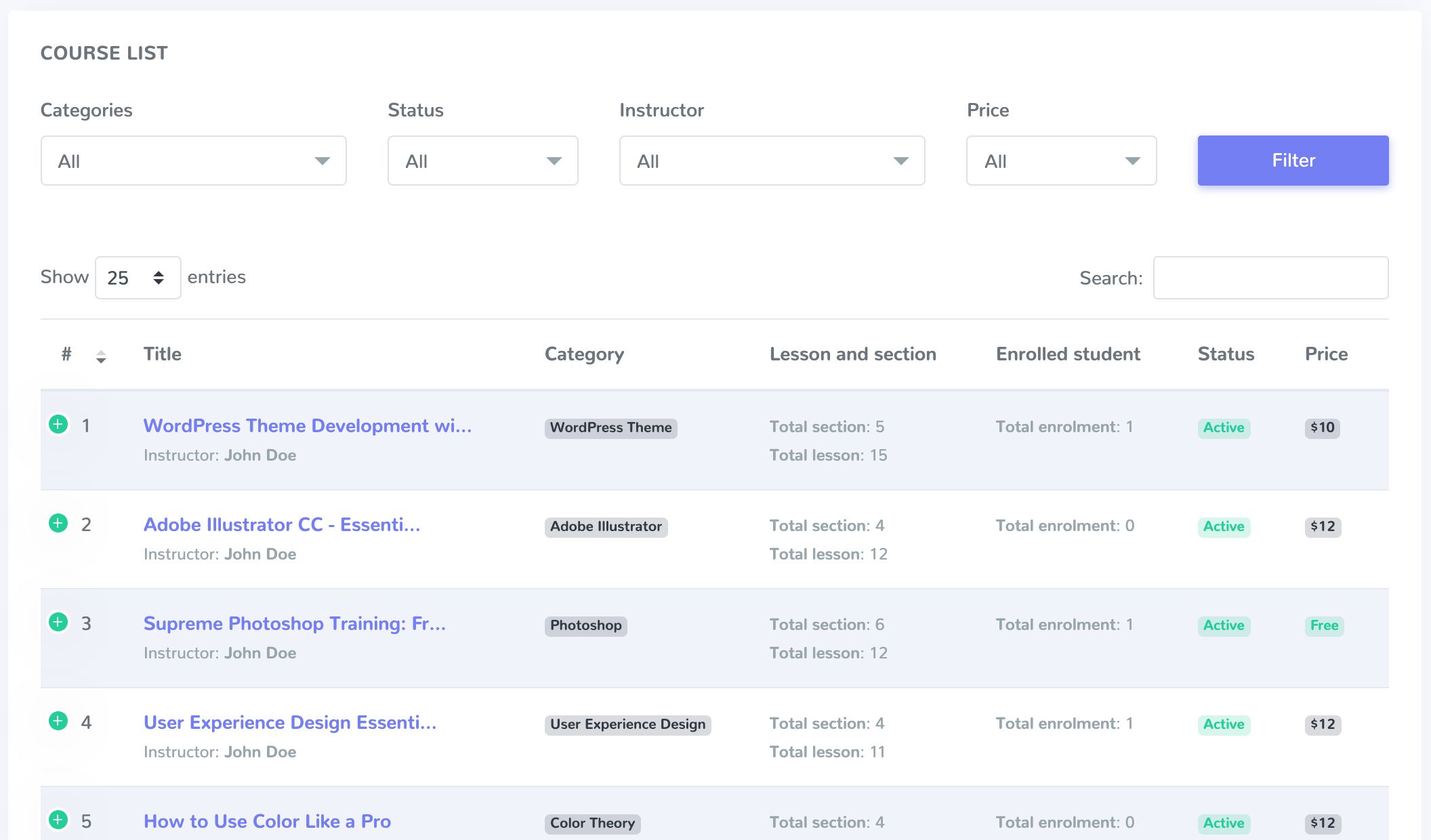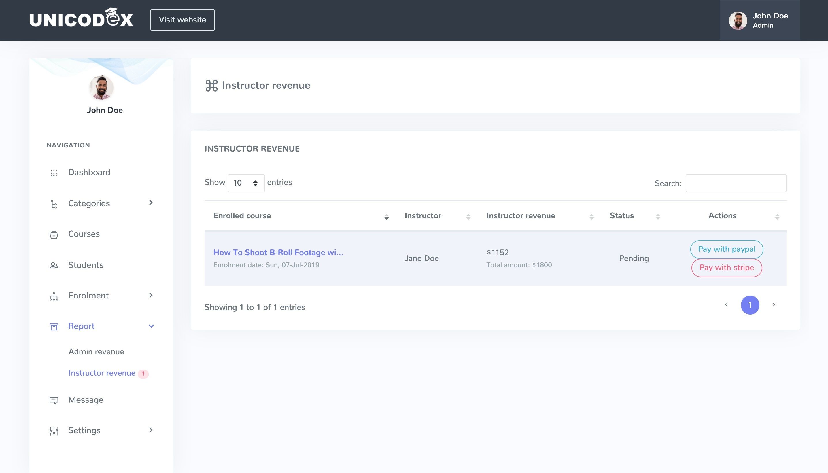 * Status Wise course creating. * Show number of courses by status on Dashboard as well as on Admin navigation menu. * Made managing sub-category more comprehensive on the category page. * Added icon picker on Category and subcategory add and edit form * Added an instructor filter on course table. * Separated Active and Pending courses status wise inside the course page. * Admin now has an option of “View Course on Frontend” inside course page. * Admin now can make a course Active as well as Pending. * Made Course overview URL optional while creating a course. * Made Course thumbnail optional while creating a course. * Made generating Lesson’s video duration more understandable. * Added an optional Payment information field for Student. While creating and editing student. It is required for Instructors only. * Added Enrol a Student option. Now admin can enrol a student manually from the backend. * A new navigation menu “Report" has been added. * Admin now can see all the revenue he got after a successful course purchasing. * Admin now can see all the revenue an Instructor got after a successful course purchasing. * Admin now can pay instructors. * Made Updater module functional for future updates. * Added two different Logo Uploader. One for backend another for Frontend. * Added Favicon uploader. * Added Instructor settings inside Settings option. * Fixed the “Action” Button breaking on small devices. * Dynamic footer text.