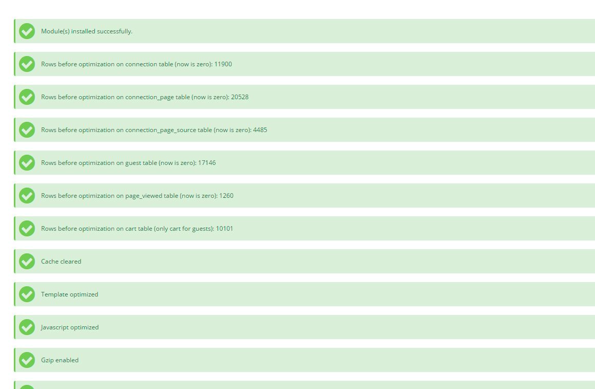 The module also optimizes all tables in database and eliminates expired discount vouchers or abandoned carts, to improve the size of the database. And now,fix queries, Â repair tables to delete garbage from the database, and show in the Dashboard (need module reinstall). And you can also delete the valid orders by date and abandoned carts from users. For big stores, this help to delete old orders by date and save space on database.