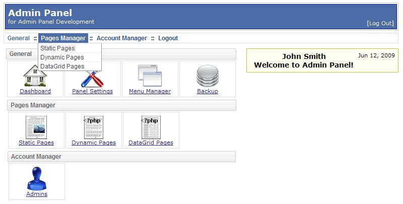 your new or existing site. ApPHP AdminPanel allows you to create DataGrid pages, even without programming knowledge! It dramatically reduce the development time of your web application.Â