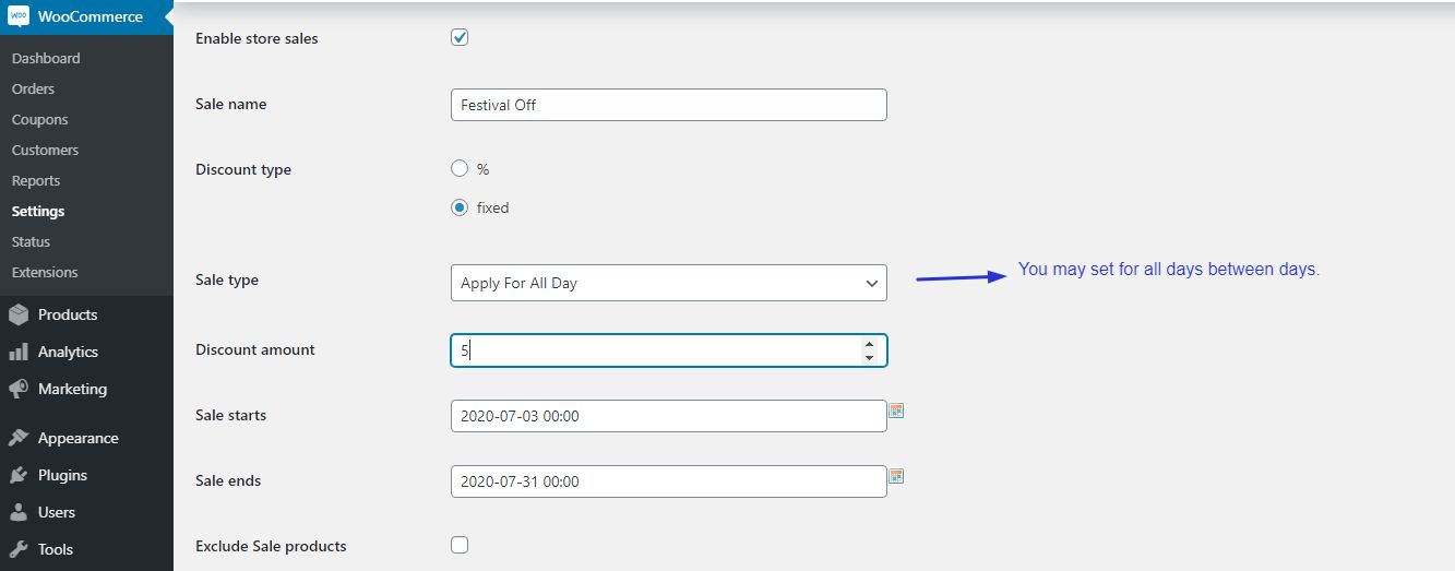 An eCommerce store sale for WooCommerce products such as day wise OR weekly. You can open sale on your store by festivals, early stock sale and any occasions for time duration or days wise.