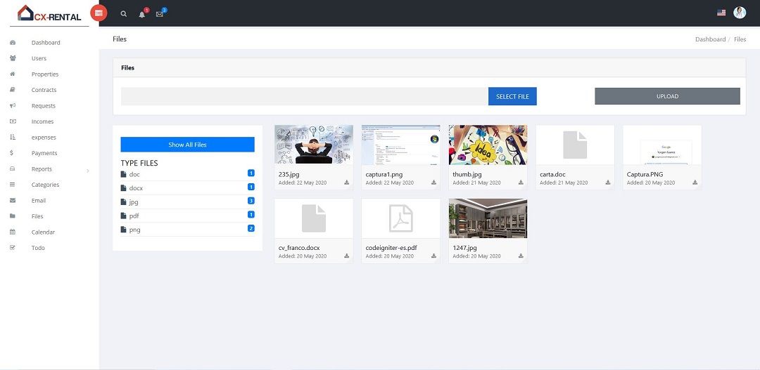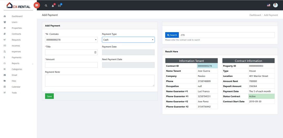 CX-RENTAL is a management and control system for the rental of homes, houses, apartments and rooms. This project is developed in Codeigniter, mysql and bootstrap, the system has modules for registering and managing tenants, homes, contracts, expenses, income, expenses, payments, among other functions. it is very easy to adapt it to any of your needs.