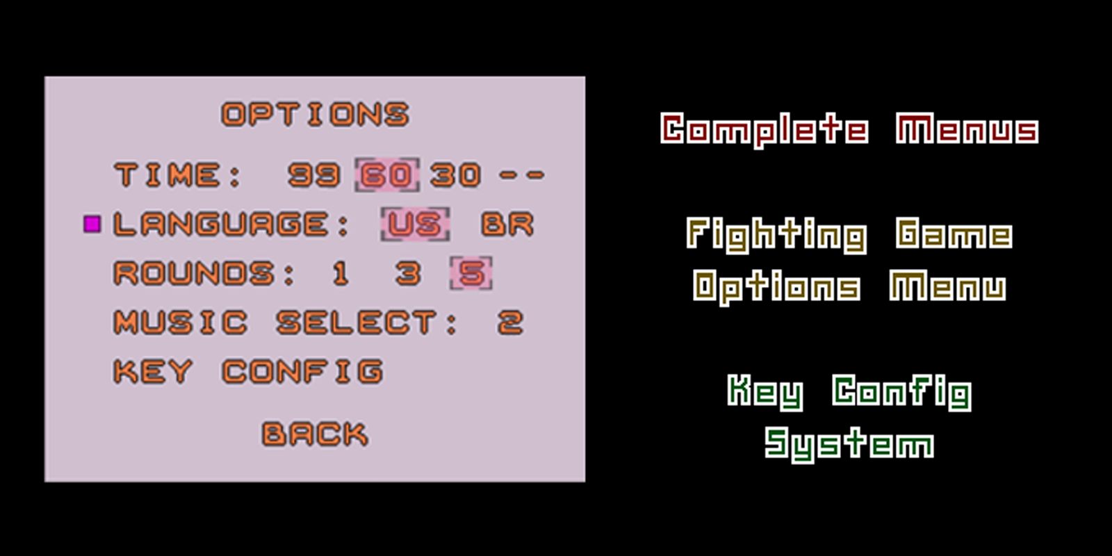 - Complete fighting game style options menu (time limit, number of rounds and music select);