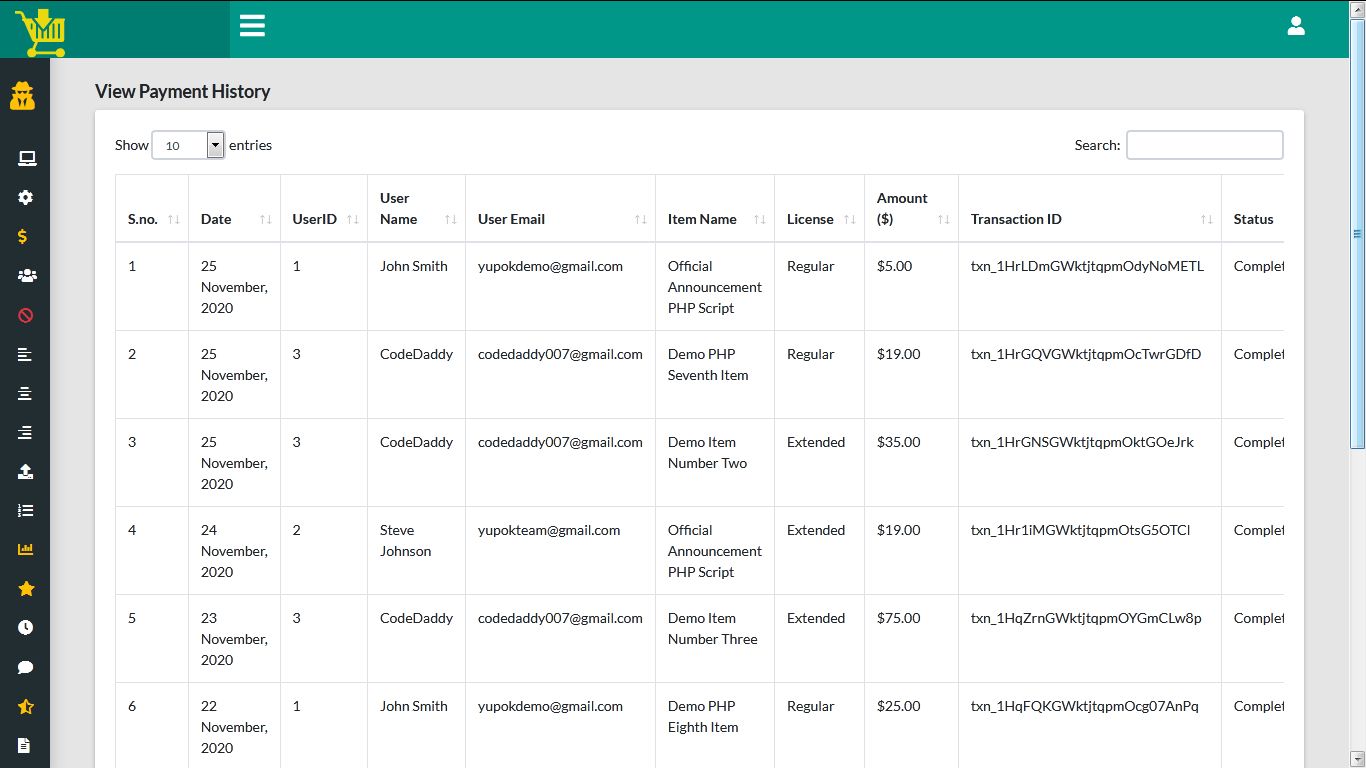 - Payment History like Date, User ID, Email, Name, Item Name, Item License, Amount, Transaction ID & Search.