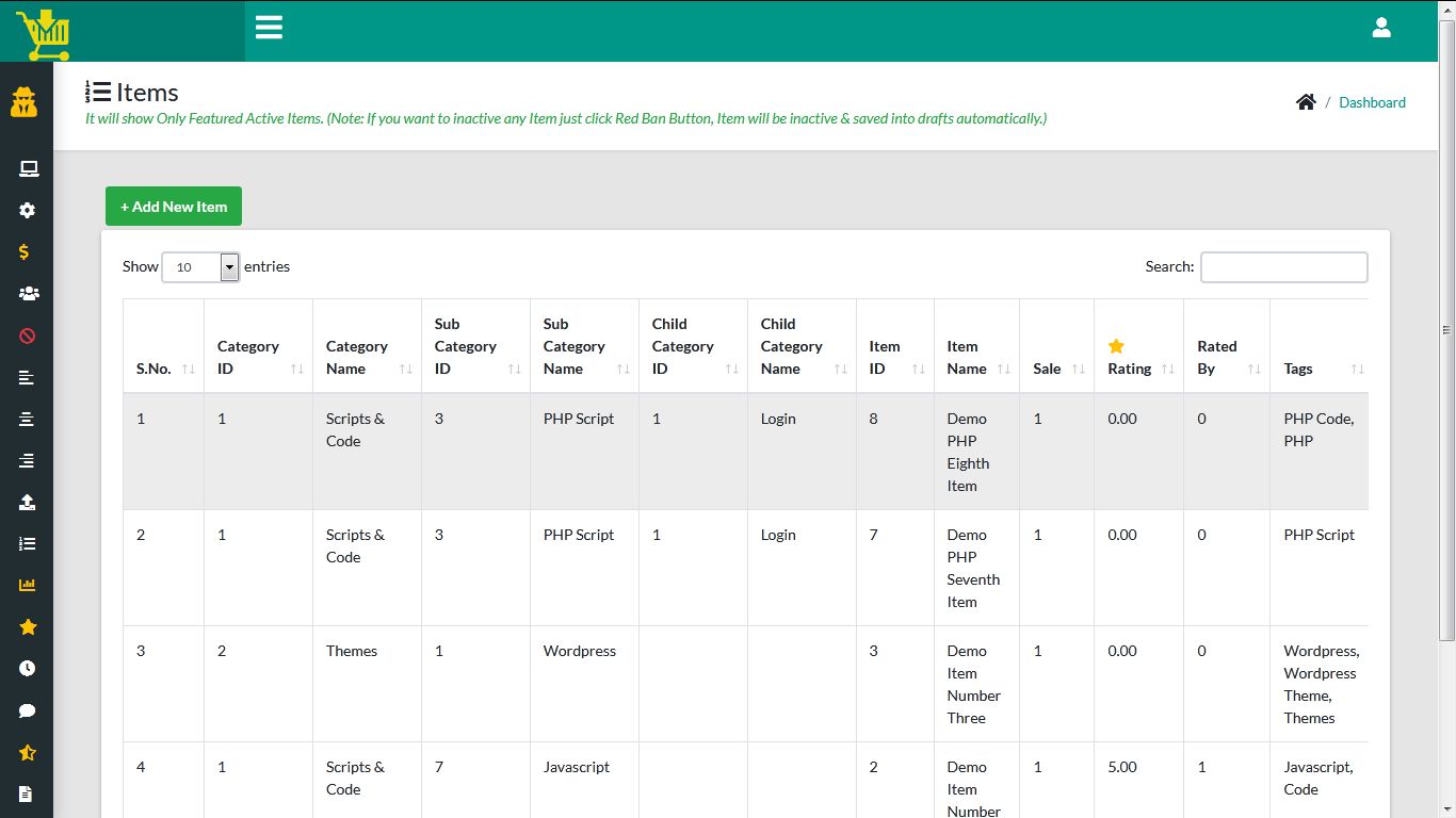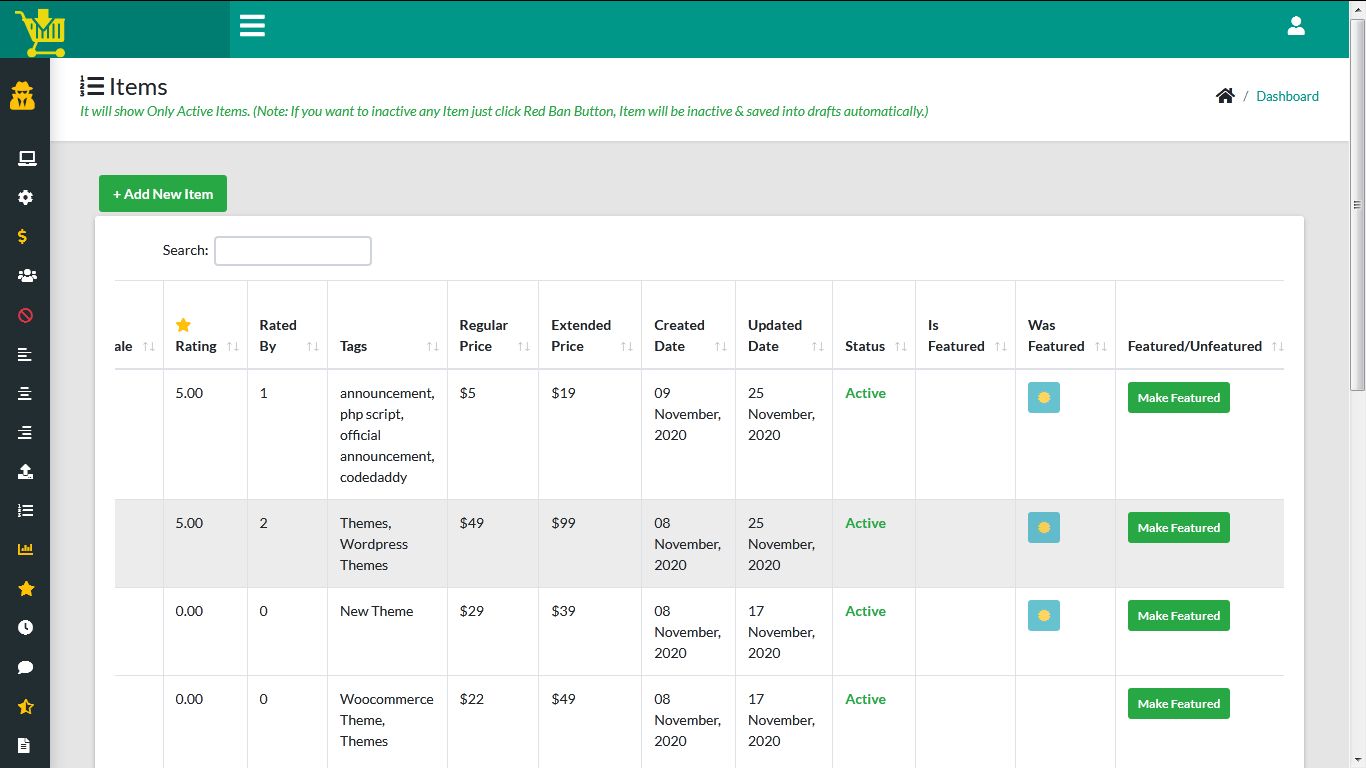 - View Item Name, Tags, Sales, Rating, Rated By, Created & Updated Date & Status