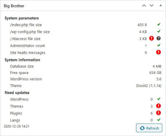 /.htaccessfile size (In case of discrepancy, the change is comparable.) - Count of administrators (Shows new administrators, their profiles are available with one click.)