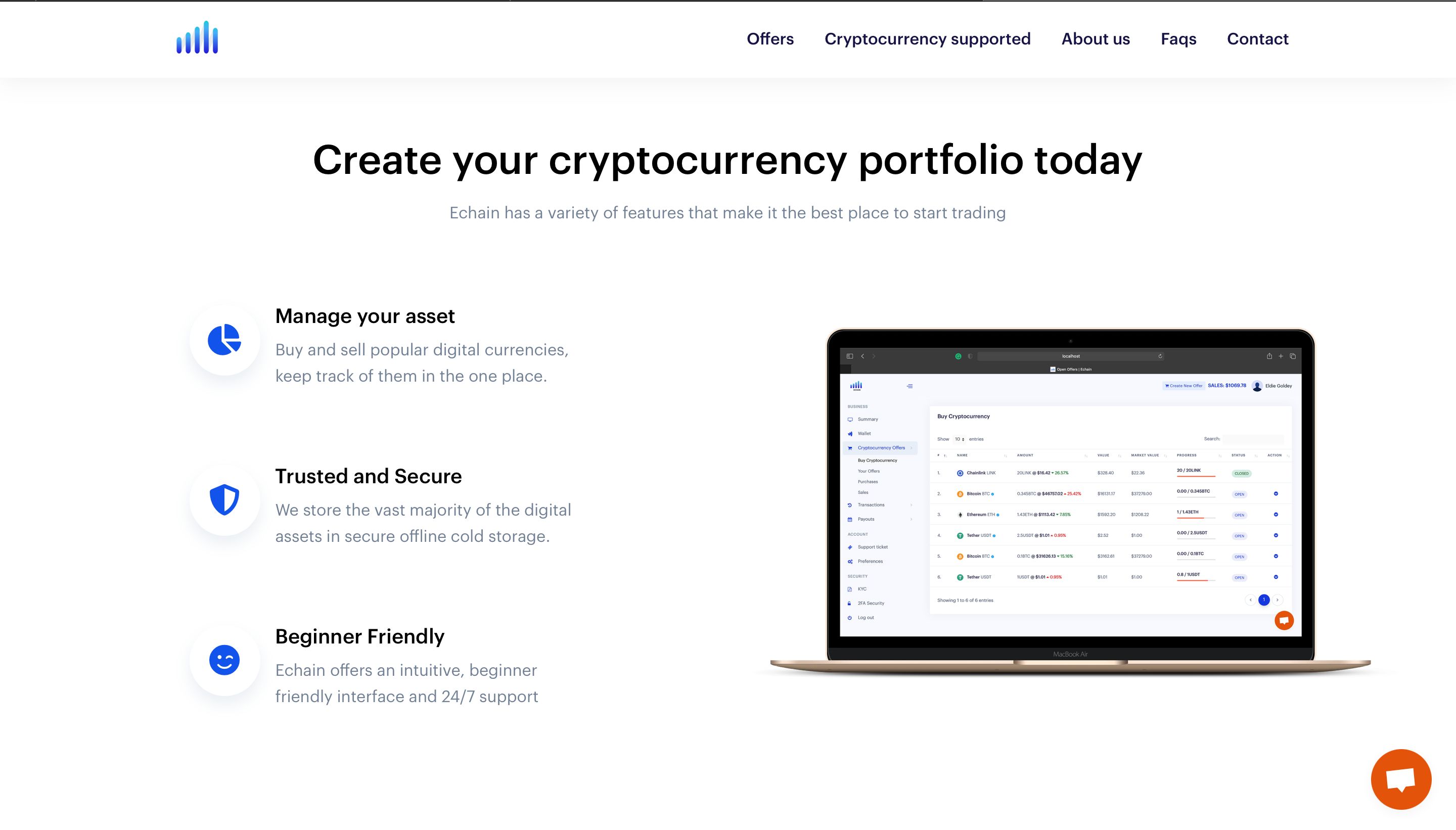 Echain is a cryptocurrency buying and selling platform. It enables users to create their cryptocurrency offers at their market rate. It supports swapping, transfers of cryptocurrency from their wallets. Echain currently supports ten cryptocurrencies such as BTC, LTC, BCH, ETH, LINK, DOT, ADA, XLM, XRP, USDT. Users don't really need to buy offers to get cryptocurrencies, it can also be done by just funding your wallet. Payment services such as Paystack, Flutterwave, Paypal, and Stripe were integrated to make purchasing of offers very easy. It runs on the latest version of Laravel so we guarantee security is no issue. We are doing continuous improvements to make it more stable in the long run.