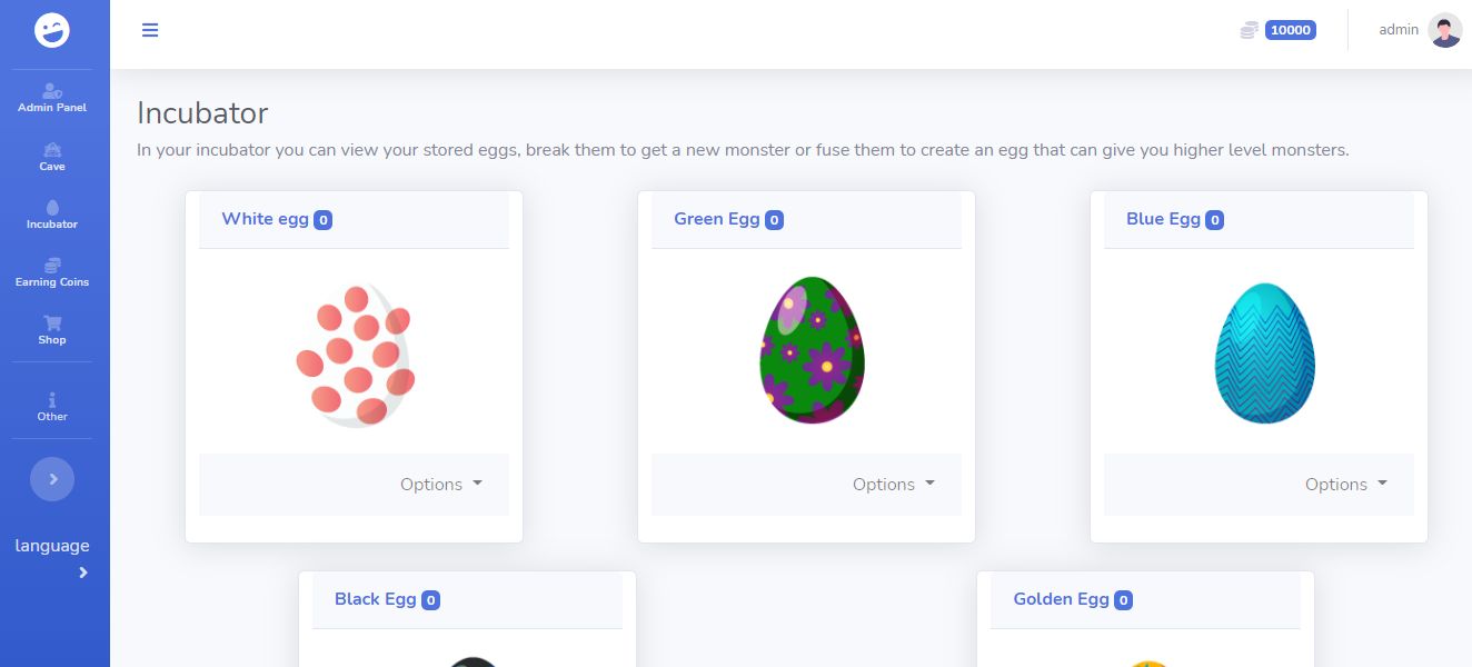 - Add, remove and edit monsters and eggs from the admin panel