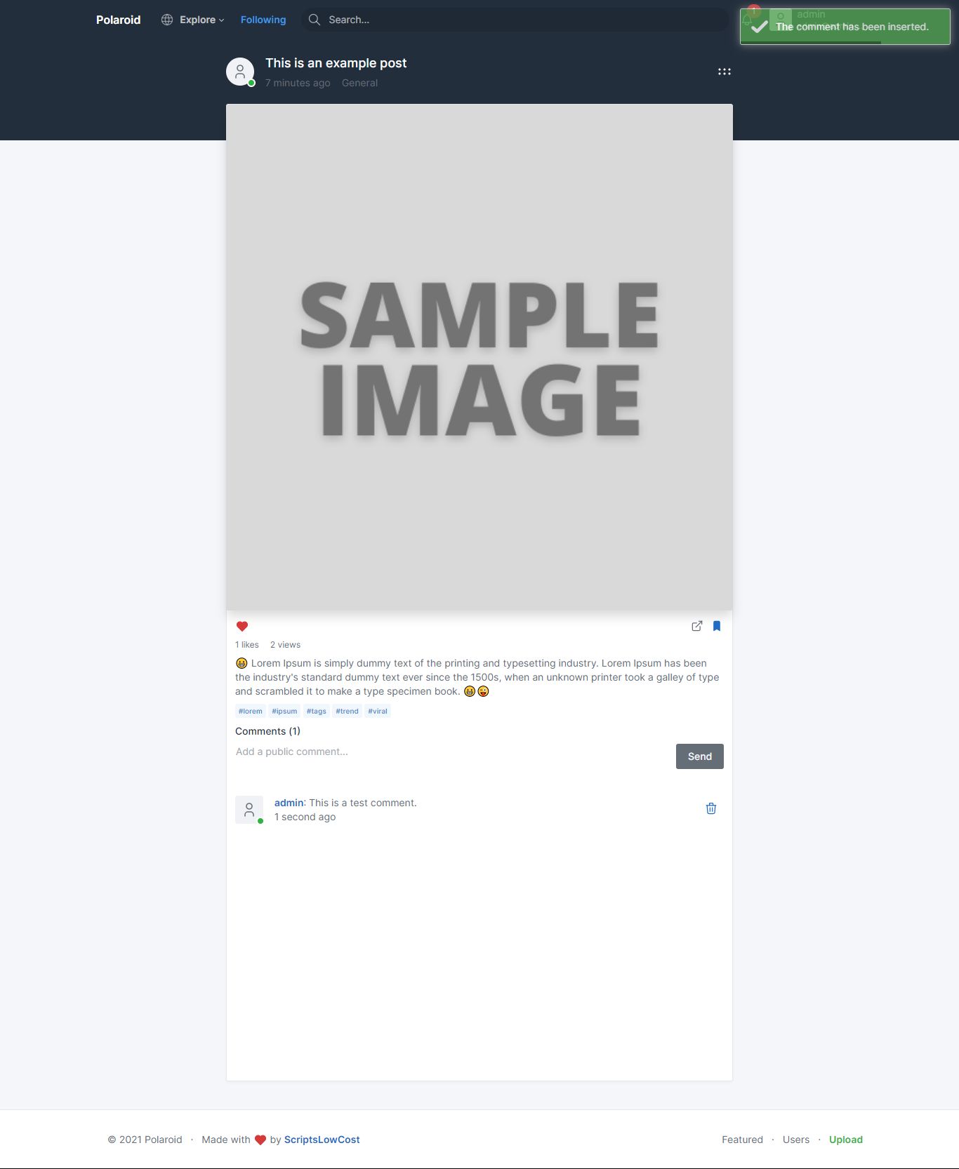 Good script but i miss a few things like maybe a download button in the post page so that people can also download the pictures, the possibility to also add emoticons in comments, a friends section so that people can sending and accepting friendship requests and a private messages section so that people can also send private messages to each other. These things would make the script great and valuable.