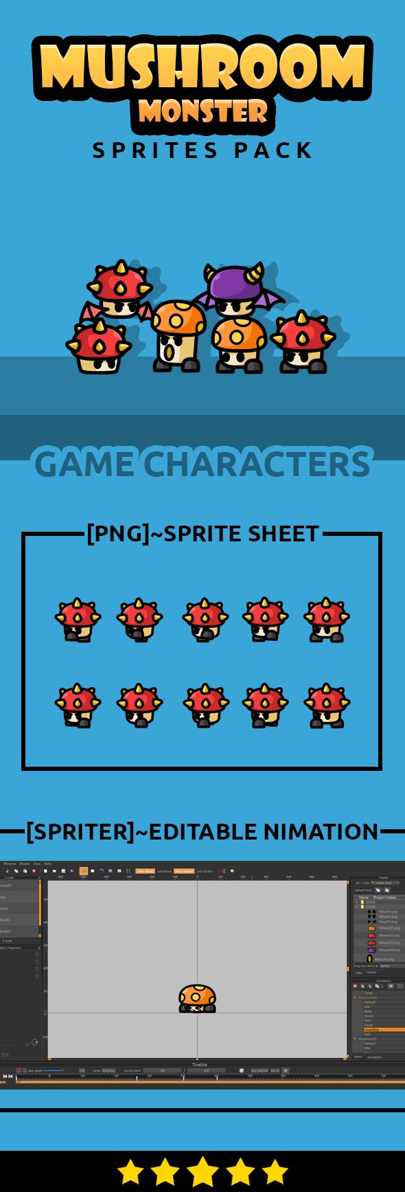 Mushroom Monster Sprites Pack is a 2D game asset in the form of Monster/Enemy characters complete with animation with a Simple Cartoon styled character. that suitable for platform game, side-scrolling game, and more.