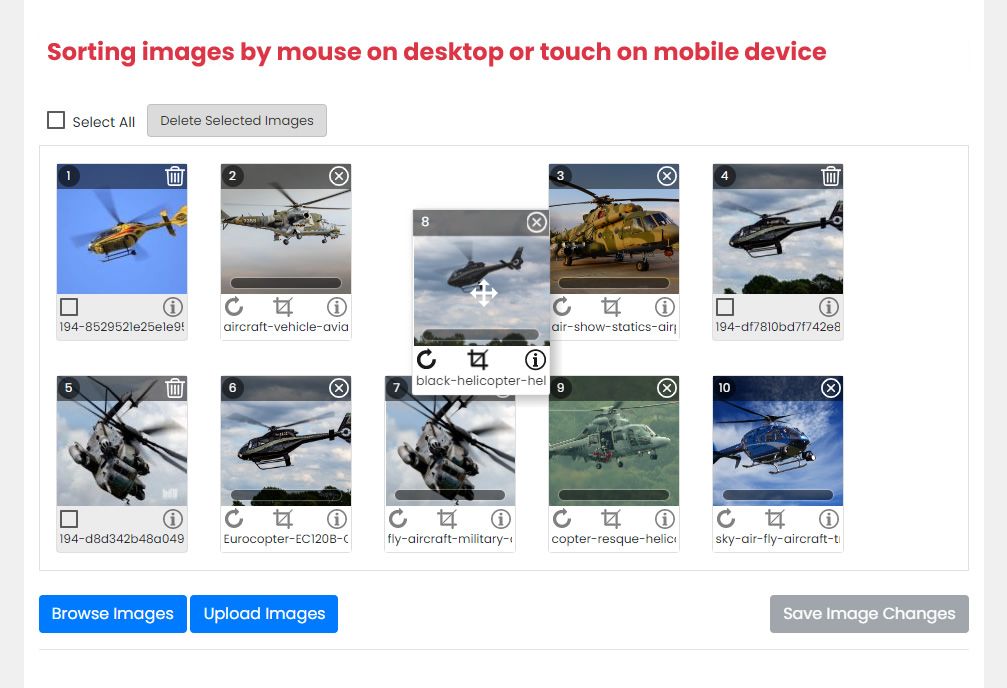 Images can be cropped, rotated before uploading. It can be sorted by dragging with the mouse on computers or by finger dragging on mobile devices, and information can be added for each picture.