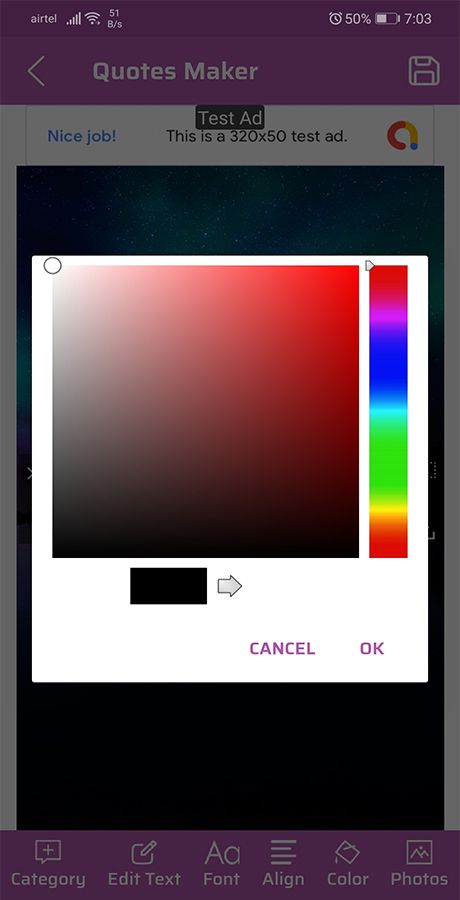 Quotes Maker ready with customizing options such as background, text colors, text size, and fonts...