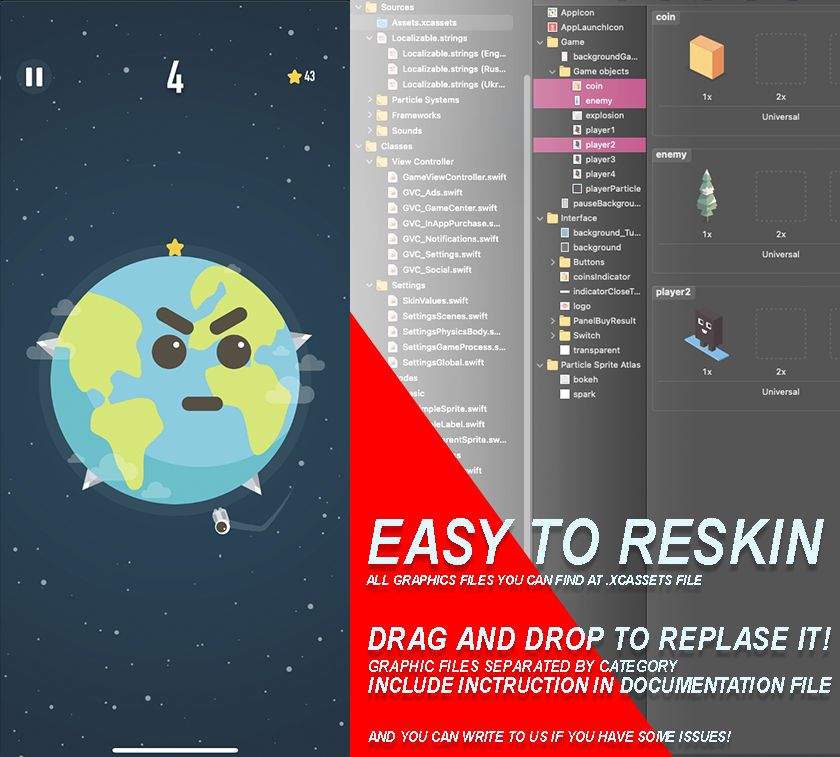 The game has skins, user can buy them for coins. You can easily add more skins (It’s described in the documentation).