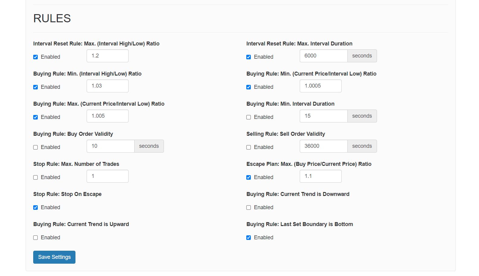 Several parameters/rules can be set to automate/implement trader's strategy.
