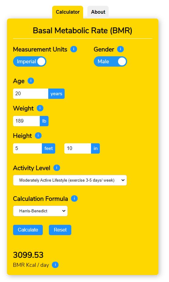This WordPress plugin can be used to add a block which will calculate your Basal Metabolic Rate (BMR) and will tell you how many calories you should take in the entire day based on age, gender, weight, height, how much activity you do in an entire day, calculation formula.