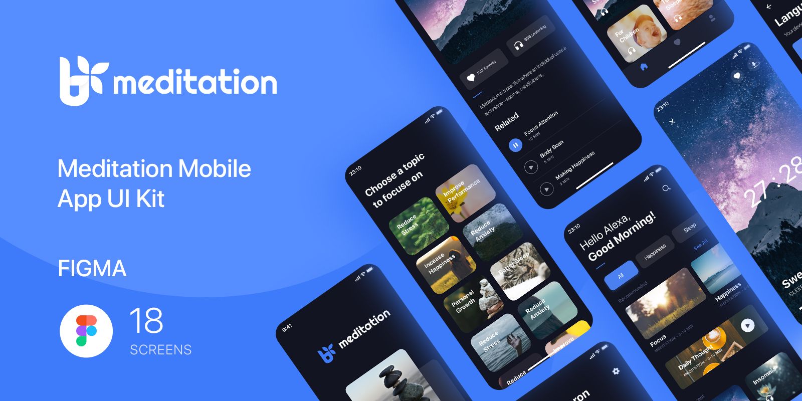 Meditation - is a Mobile App UI Kit. It includes 18 mobile screens, Well Layered & Organized.Meditation - Mobile App UI Kit - Figma