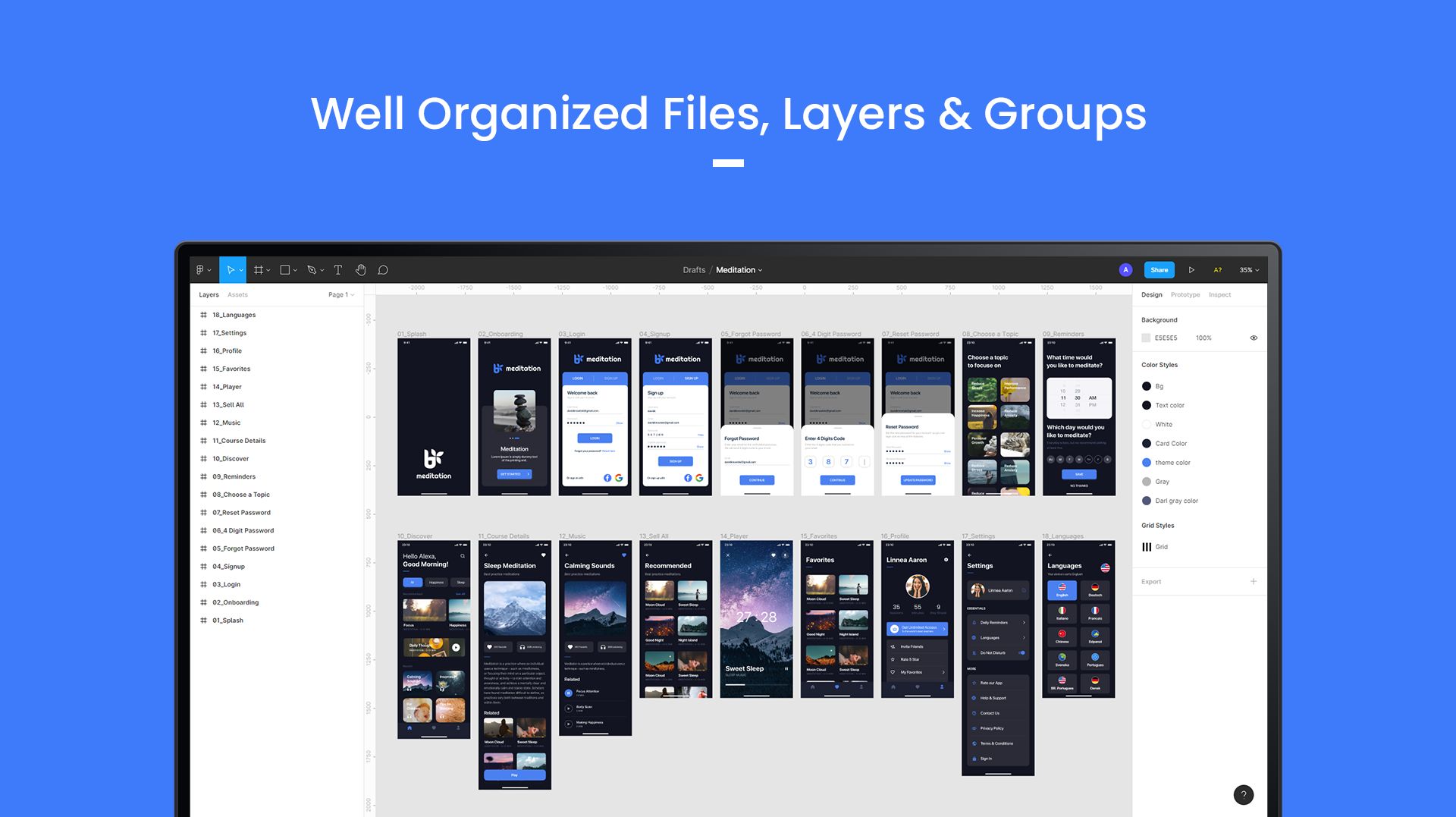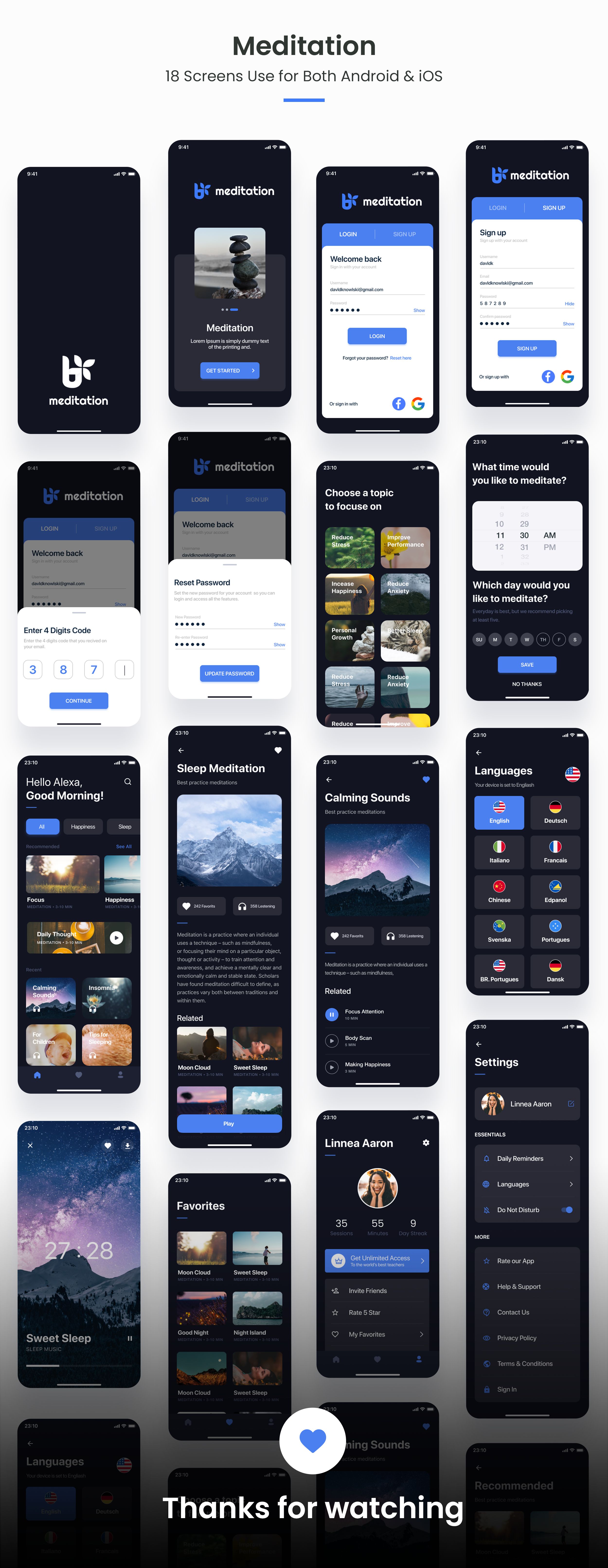 Meditation - is a Mobile App UI Kit. It includes 18 mobile screens, Well Layered & Organized.