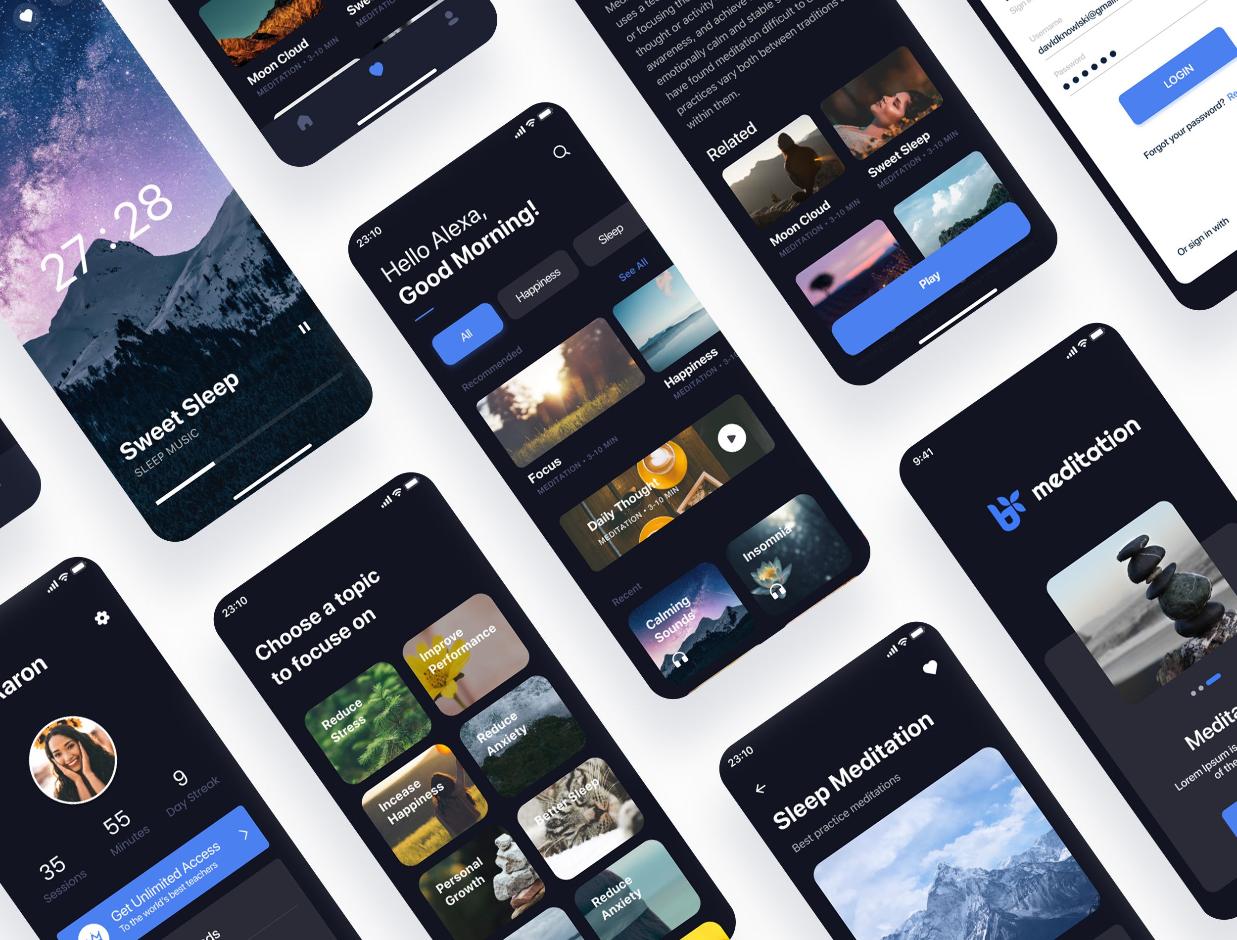 Meditation App screens: