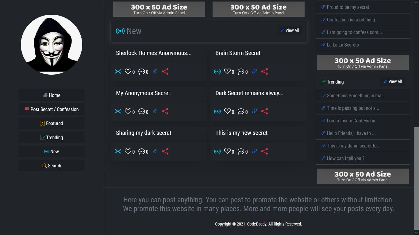 | Tags | post, anonymous, php scripts, secrets, codedaddy, confessions, anonymous secrets, anonymous confessions |