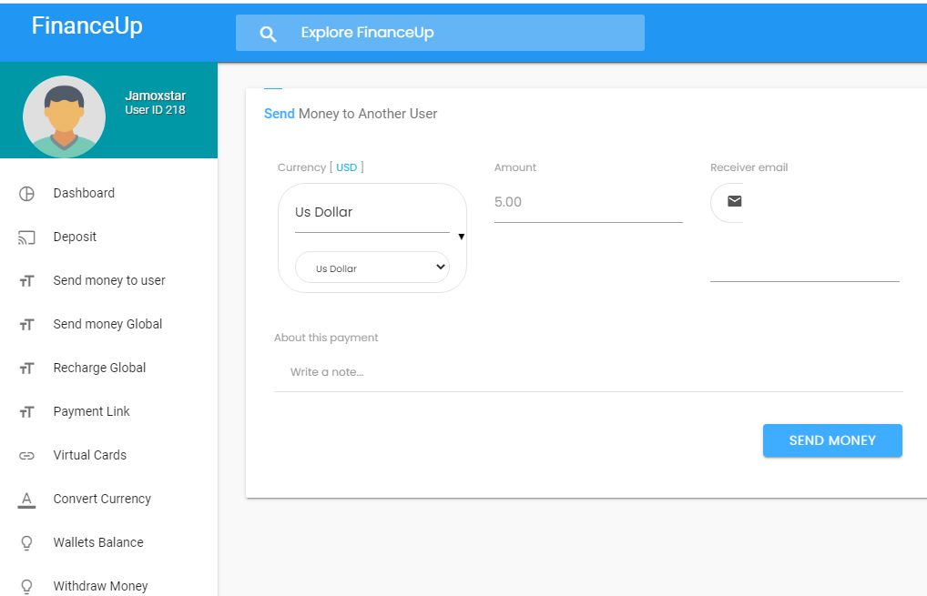 Financeup is a powerful, completed fintech financial payment script comes with features like Send money to another user, send money across the globe both automated and manual process, Recharge airtime to any number to 140 countries, payment link for every users, virtual card creation and lots more, auto-deposit, it’s easy to install setup your own fintech business within 5 minutes without any technical knowledge.