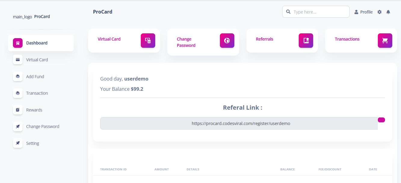 ProCard is a PHP Platform that Can be used as the selling platform for Virtual Cards . The card can use to verify paypal account, purchase anything anywhere online such as facebook ads, Google ads, ebay, amazon, apple and lots more. This Script come with Payzoft USD Virtual Card API, Do you like to start your own Card issuer company/business? Procard is the best script for the card selling business.