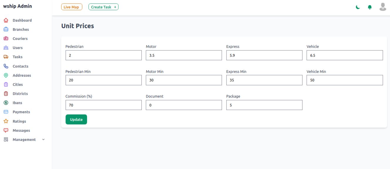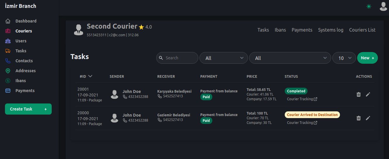 -Admin can perform courier, user, address, iban, contact, shipment, city, district, payment, rating, message, logs, unit prices and setting transactions.