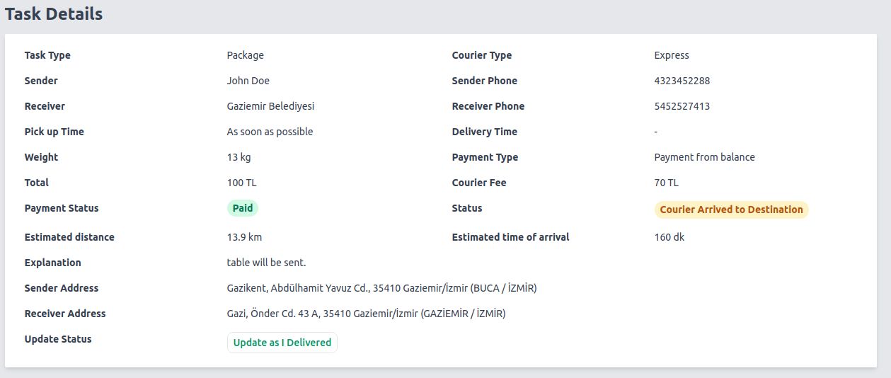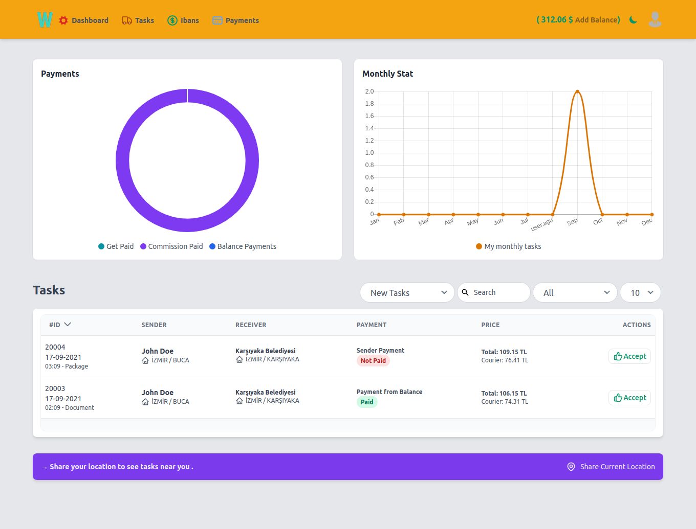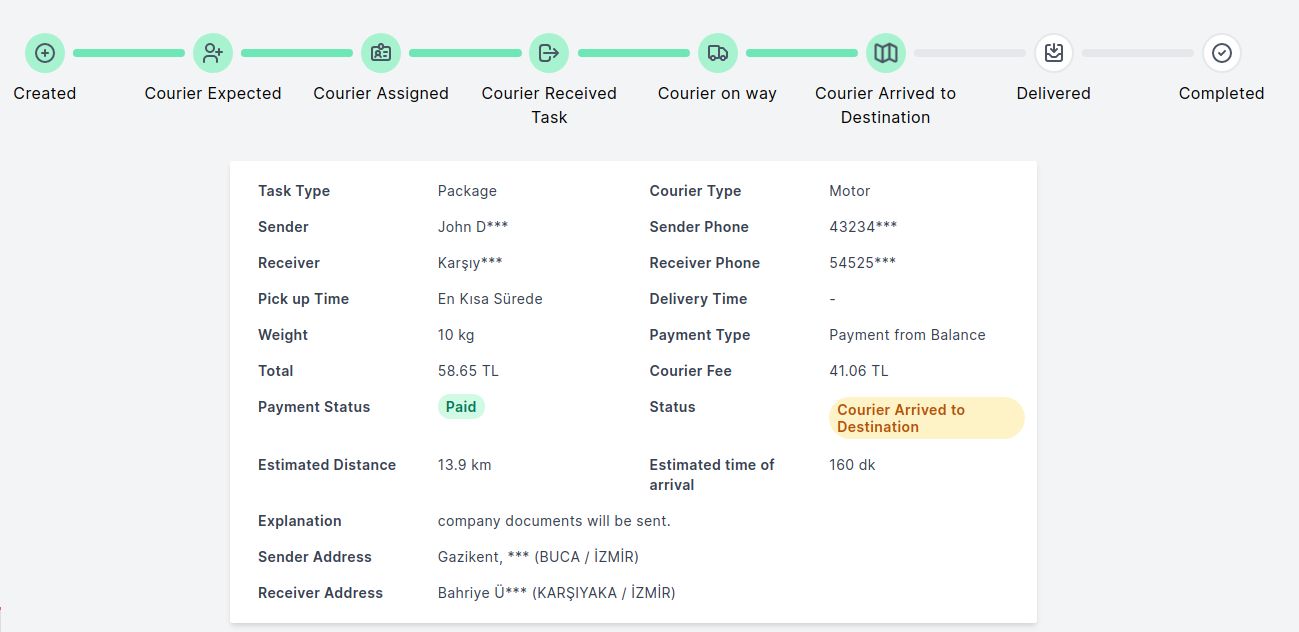 If payment type is Receiver Payment: Task will be created un paid status. Couriers can see this shipment. If courier accept that task, courier balance amount must be bigger than task company commission price. When the courier reaches the receiver address and delivered task, task status will be updated to paid and company commission price will be withdrawn from the courier balance.
