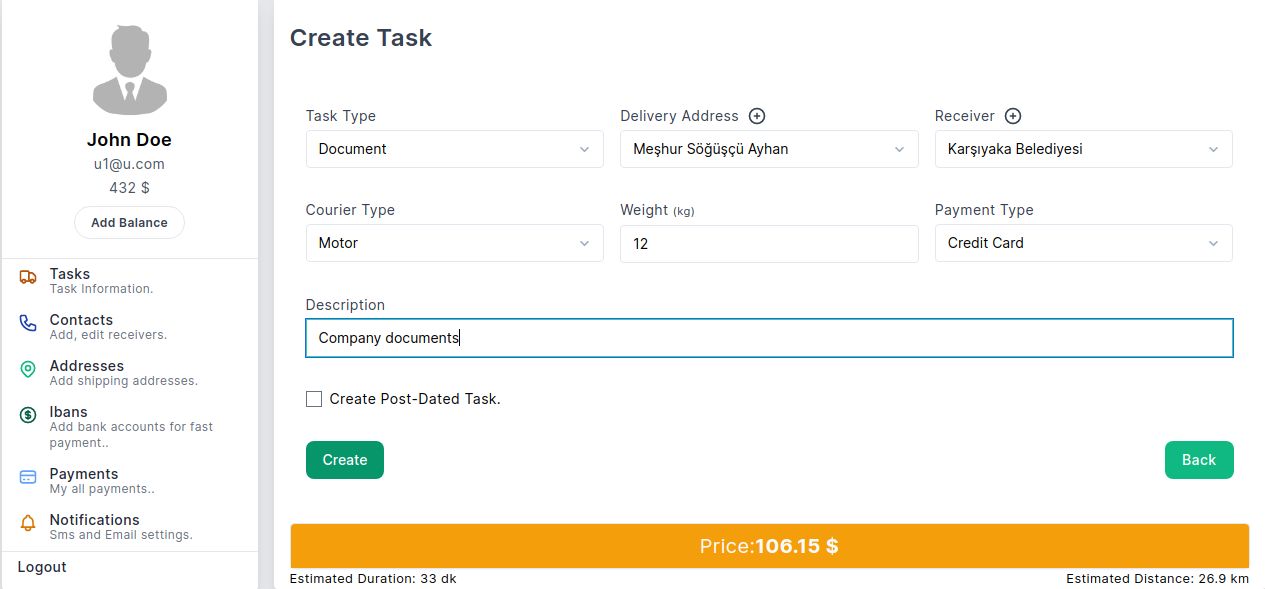 -User selects task type, delivery address(from addresses list), receiver(from contact list), courier type, payment type, and enters weight, description. So, price will be calculated automaticly(based on unit prices and address distance).