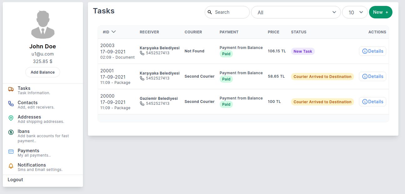 If payment type is from balance; shipping price will be withdrawn from the user balance.The courier balance will be increased according to the commission rate when the task is completed.